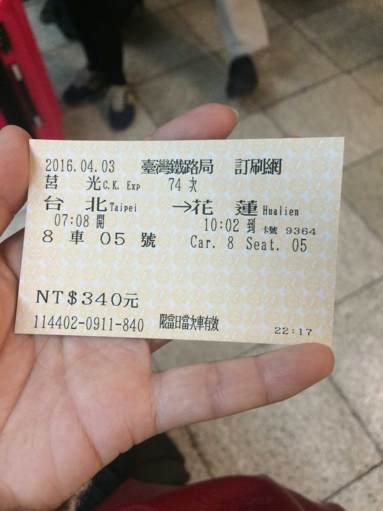 早上8:20搭自强号:约2.5小时,台北到花莲的票价是440台币(约91元人民币)10:50到达。