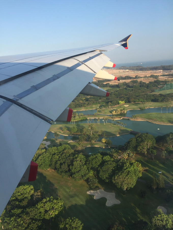吃吃喝喝好不开心三个多小时的飞行很快就过去了,广播通知即将降落时才发现起飞前的空中和到达坡国的天空格外不一样,云彩和蓝天美不胜收,坡国的机场附近算是高尔夫球场,在即将降落时下面也犹如一幅画。听说在空中也能同时看到马来西亚,但是我完全分不清在哪,所以忽略吧!