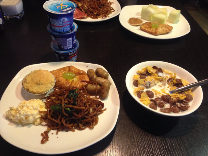 不得不夸这个酒店,除了有每天喝不完的饮料还有非常棒的早餐,订房的时侯考虑到第一天是在进岛玩,就订了酒店的早餐,早餐是西式自助餐,好多都是我喜欢的,比如酸奶呀(4个味道,草莓,芒果,树莓,原味)酸奶是我最爱,一早三小瓶一次吃个够,哈哈!太爽了。各种西式糕点,还有麦片,意粉,纯奶(我有看到里面的服务生倒入牛奶都是进口的纸包装奶源,味道浓郁纯正,超赞噢!)我放开肚子大吃,吃完就准备去岛上好好玩,只有吃饱了才能满满能量。可圆圆猪就比较闹心了,她喜欢的口味是中式的,要包子,粥,粉才能吃饱,已至于到中午我还在环球嗨嗨的玩时她就饿晕了。