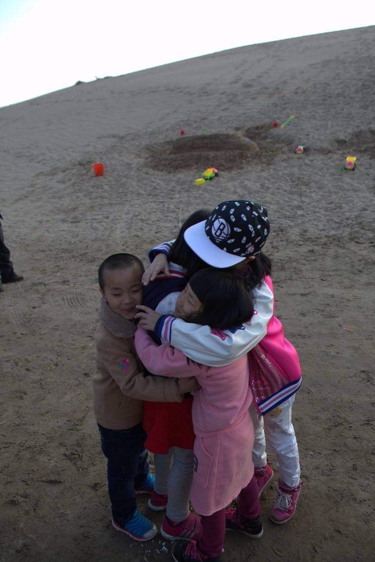 这张照片感触比较深,老殷和我一起拍日落去了,大漠队剩下几个孩子独自制作沙雕,没有能够完成任务,老殷的女儿伤心的哭了,孩子们给了小姑娘一个拥抱。