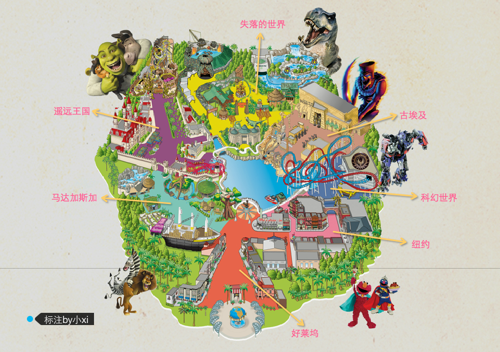 新加坡环球影城分为7个园区,以颜色划分。其中除了好莱坞大街没有任何游玩设施,其他区域都各有1-4个游玩项目。