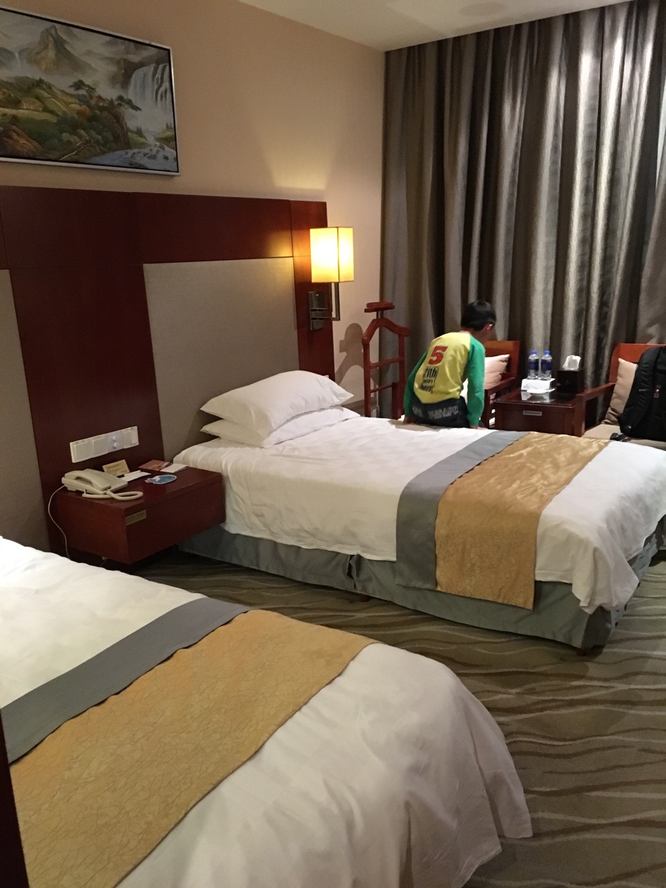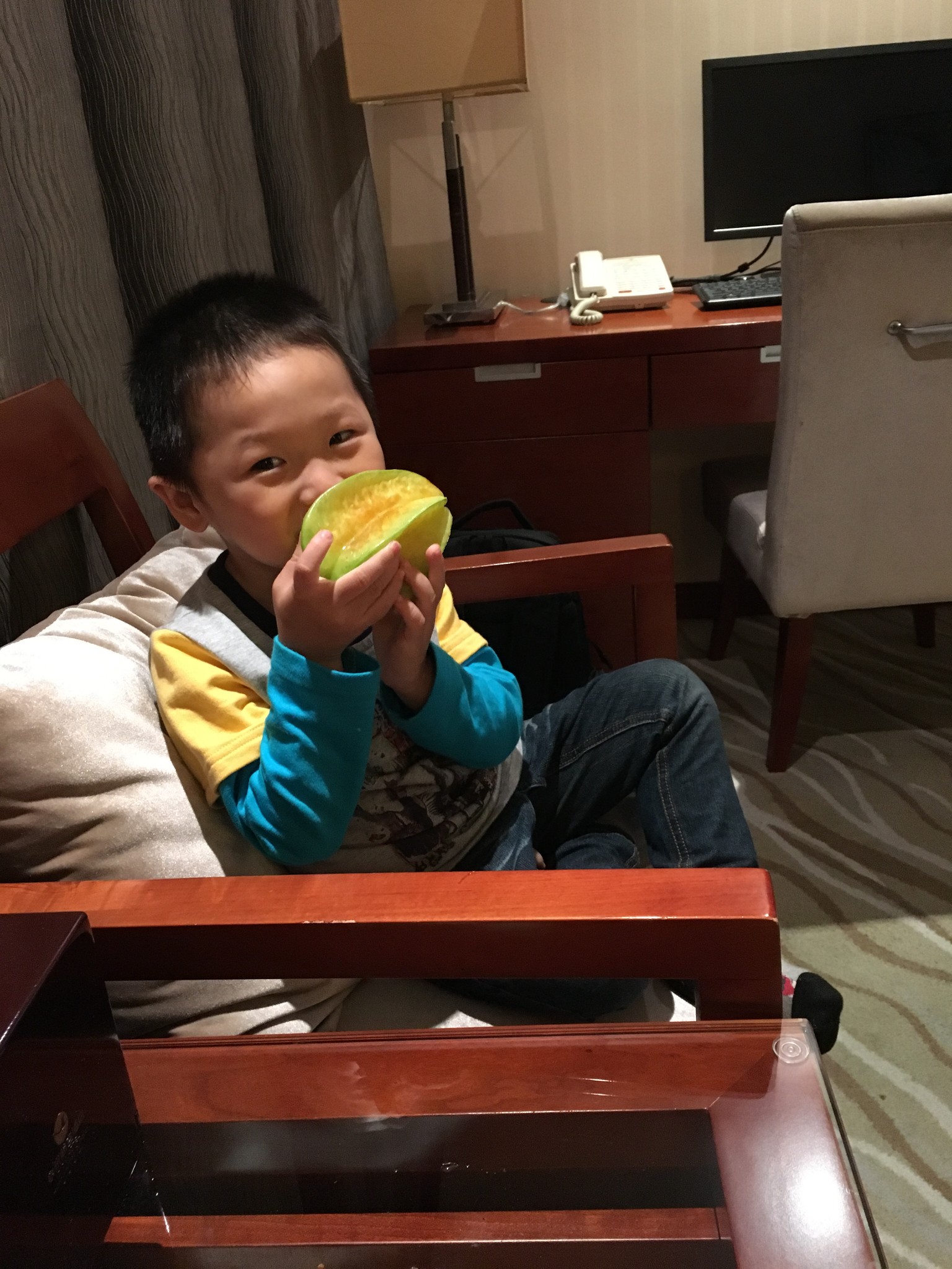 酒店赠送了水果,豆丁晚饭怎么吃,一口气吃了大半个杨桃。难得住酒店,两个孩子兴奋得不舍得去睡觉。