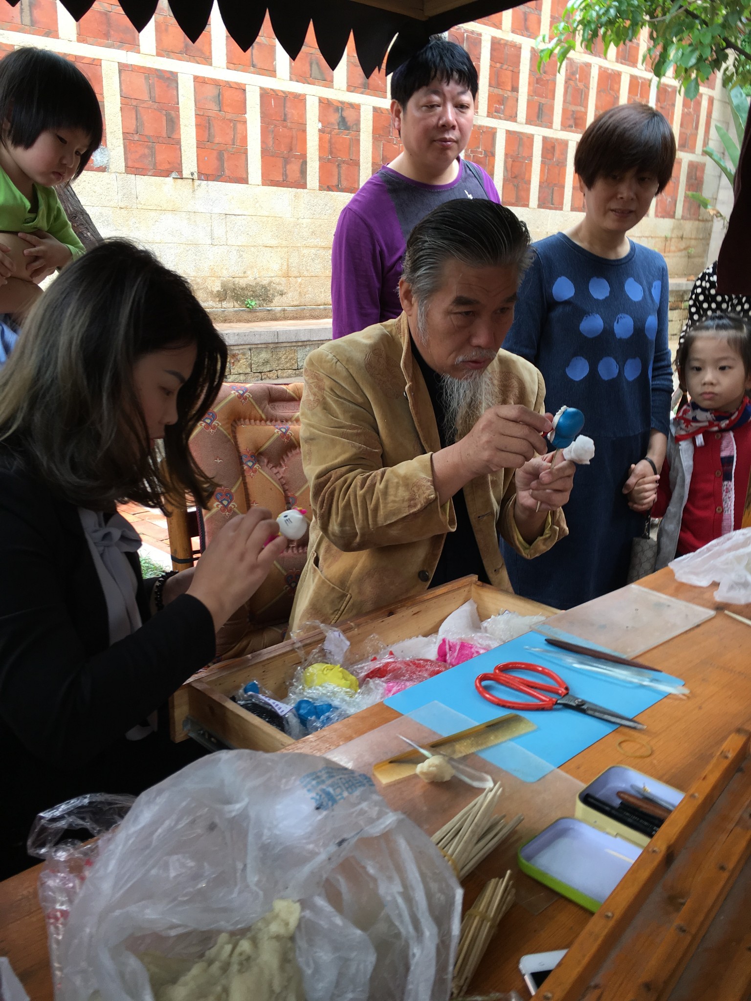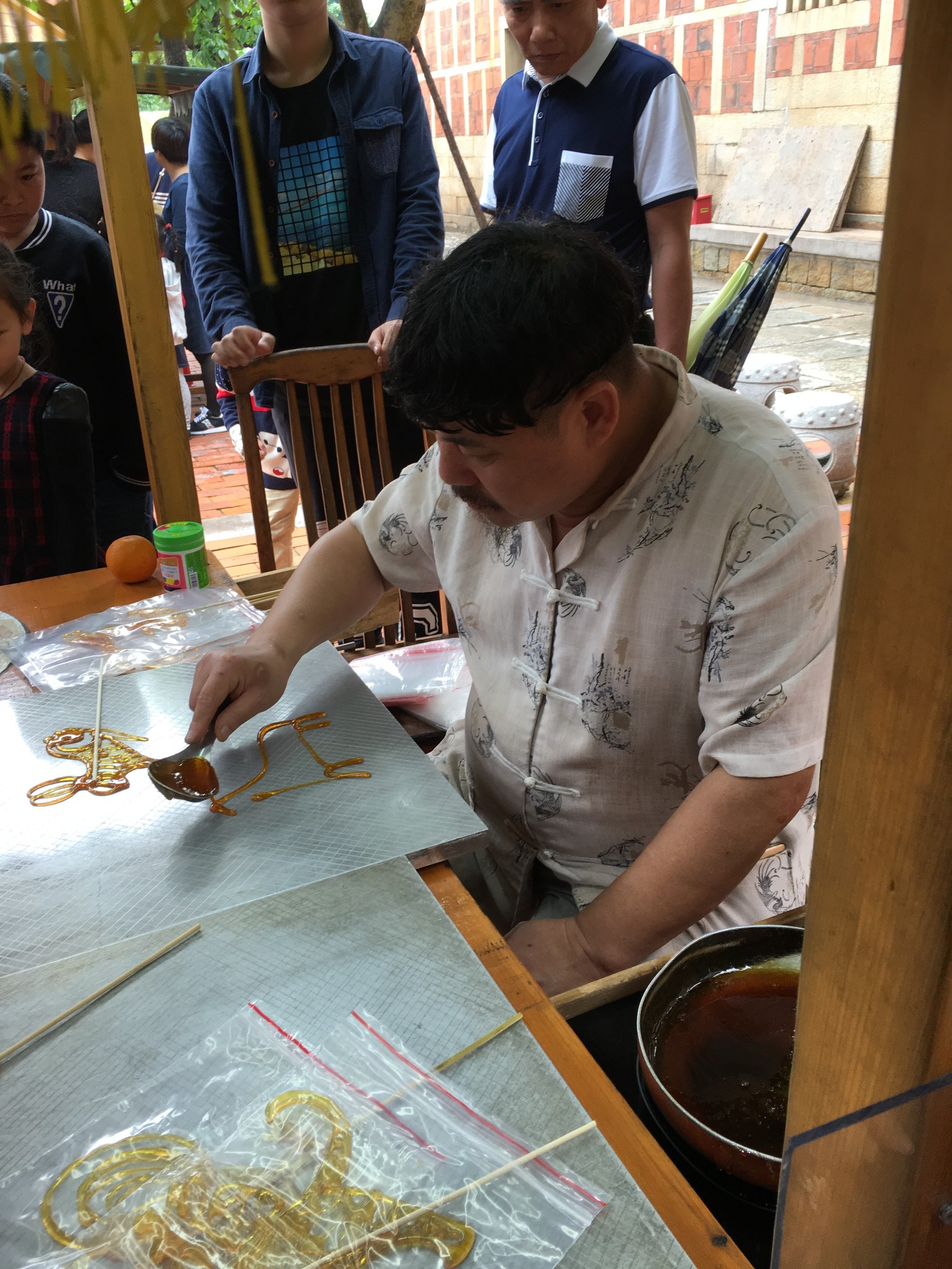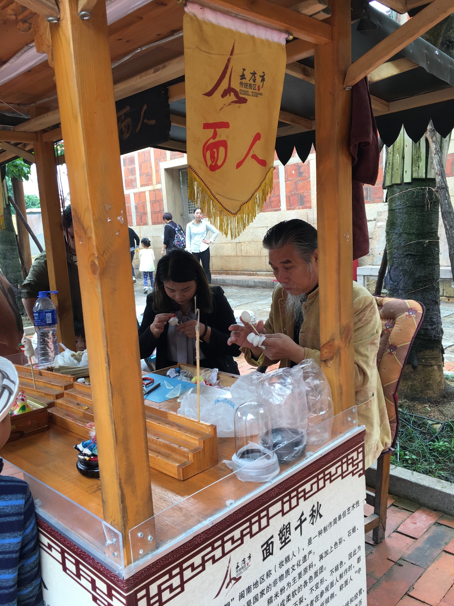戏台前的空地上,面人,糖画等等各种民间手工艺都有展示。现在也不容易见到,豆咪挨个看过去。