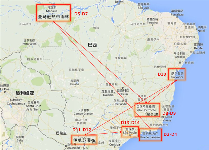 做行程的时候,确实也想过巴西再搭个国家一起走,好不容易来次南美,就刷一个地标,好像有点亏。但是看看地图,南美洲国家的面积也都不小。事先定下巴西必须要走的三个地方是里约热内卢、亚马逊热带雨林、伊瓜苏瀑布。其中里约要3天,亚马逊要3天,伊瓜苏要2天,撇开国内往返南美的3天,那么16天假期剩下的机动时间只有5天。