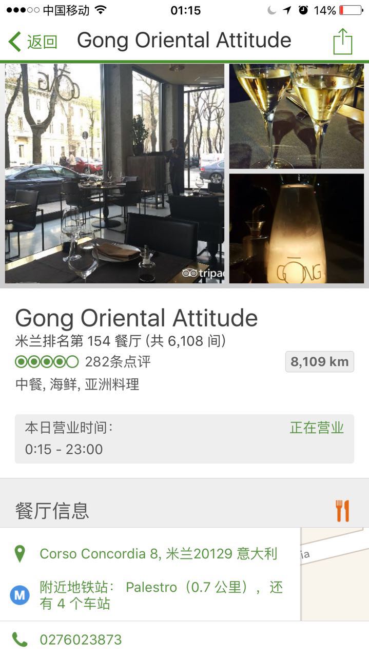 1. Gong Oriental Attitude:亚洲料理,在附近办事无意间发现的,距离大教堂3km不到,是米其林指南 (Michelin Guide) 的推荐餐厅。菜量不大,但几乎每道菜的各有特色,以至于在米兰的十天期间我们去了三次,但去之前一定要提前打电话做好预约,临时去通常都没有座位,特别是周末的晚上。推荐锅贴、春卷、红炒饭(red fried rice)、红烧肉,如果不考虑预算的话,帝王蟹、龙虾和日本和牛也都值得点,吃下来和国内的餐厅比便宜不少,关键是真正的日本和牛。