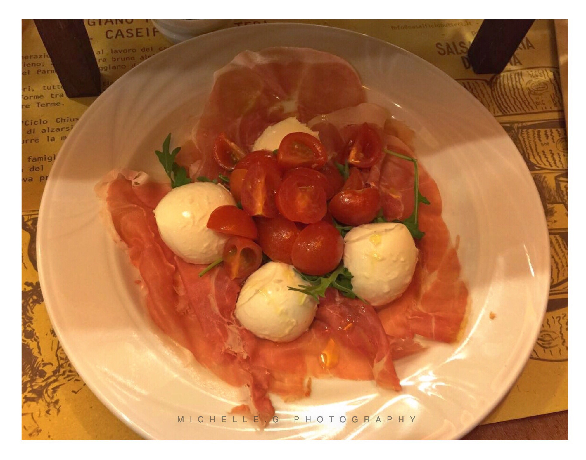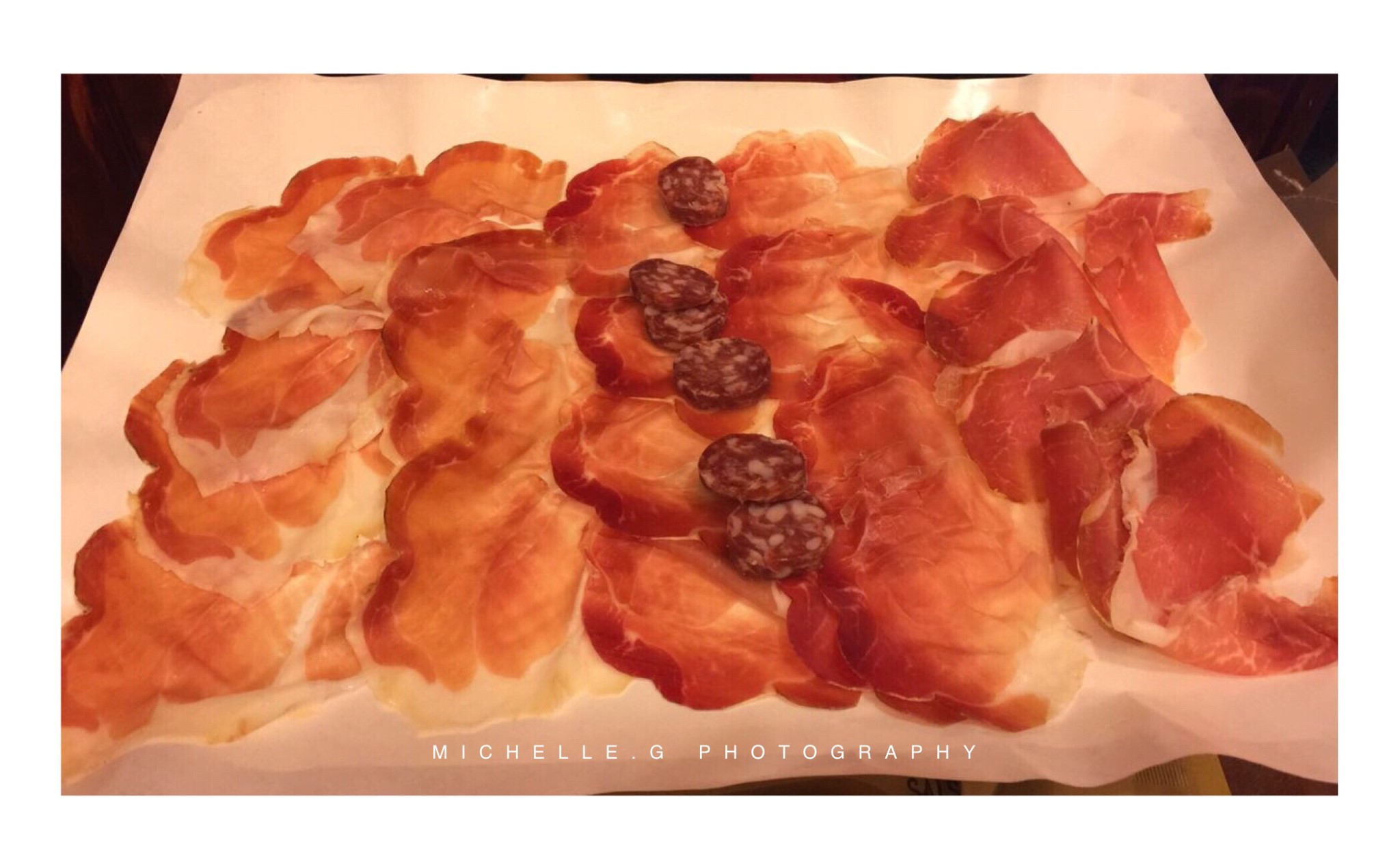 意大利人的三餐和我们差很多,除了晚餐外其他两顿都很随意,晚餐基本从傍晚的7点半才开始,几个友人相约而坐,先不紧不慢的来一杯红酒,再开怀畅聊几轮,通常一坐就过去了几个小时,翻桌率着实有点低。说到意大利餐,平时我们最熟悉的意大利面、披萨和烩饭都属于简单的餐食,而在地道的传统意大利餐里,不能不提到意大利火腿。意大利火腿的制作历史可以追溯到几千年前的罗马时期,将一只整猪的全身分成十几个部分,不同部分的味道口感都不一样,价格也因此有高有低,最好的当属后腿肉的部分。清洗、上盐腌制、风干至少12个月,制作好后将生火腿片成薄片直接食用,也可以搭配甜瓜或新鲜的马苏里拉奶酪一起食用。