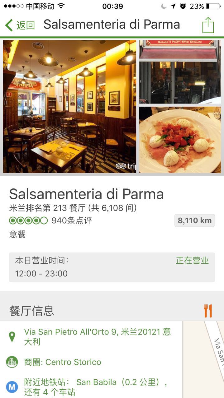 2. Salsamenteria di Parma:传统意大利餐,在名店街面对Abercrombie & Fitch四层旗舰店右边的那条路,门脸不大,但很好找。Trip Advisor上4分评价,我们用餐时慢慢开始有当地人已经在外等候,附上店铺信息。
