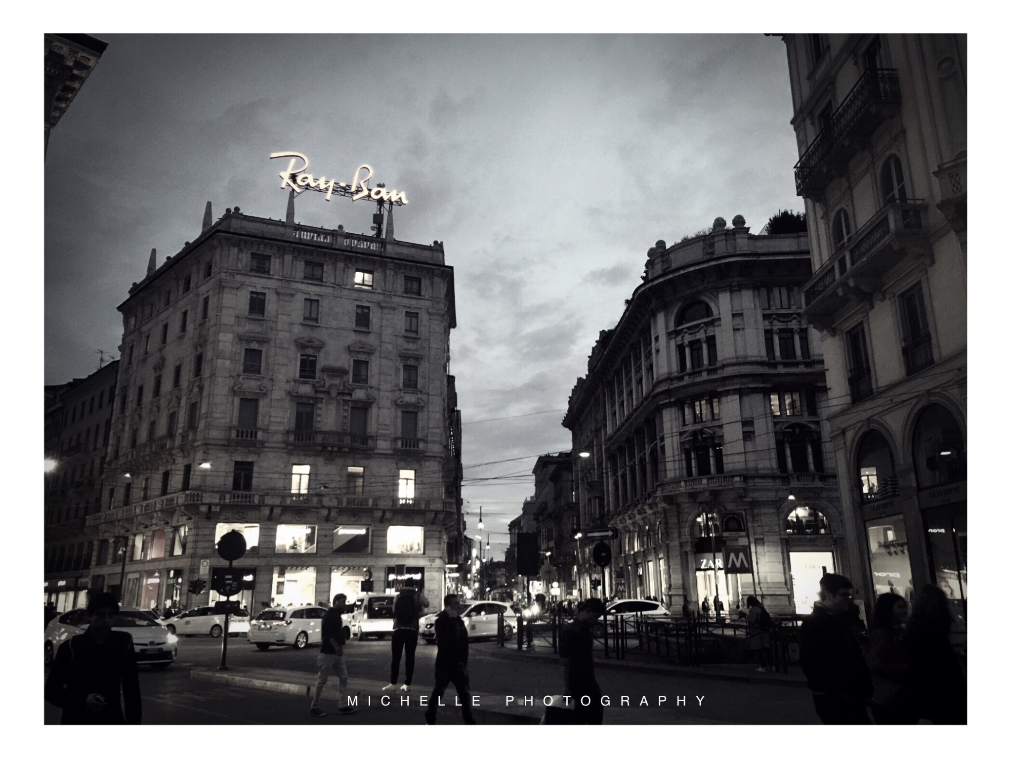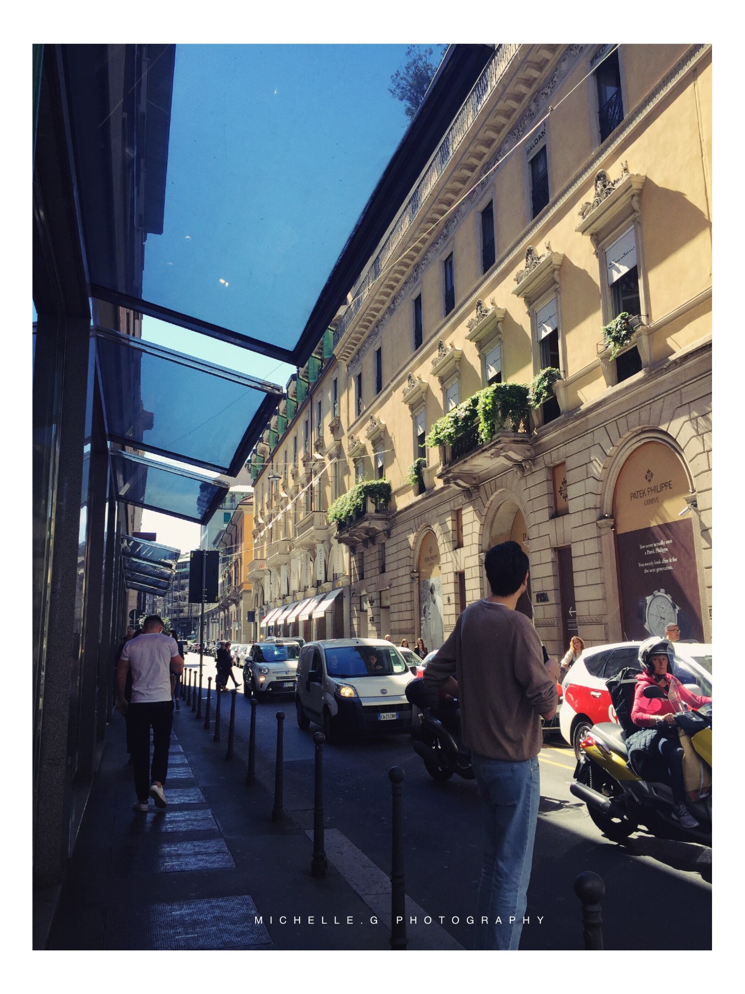 米兰作为世界时尚之都,各种奢饰品大牌在这里应有尽有。除了坐落在米兰大教堂 (Duomo di Milano)旁大名鼎鼎的埃马努埃莱二世长廊 (Galleria Vitorio Emanuele II,也叫伊曼纽二世长廊)外,更值得推荐的是离教堂东北边不远处的名店街(蚂蜂窝攻略上的黄金四角区,但配图用的不对,有顶的还是属于二世长廊,名店街都是室外的街道)。名店街由蒙特拿破仑街 (Via MonteNapoleone)以及周边四五条街道组成,路两旁一家接一家全是奢侈大牌的精品店,而像LV, Dior, Gucci, Fendi, Celine等这些大牌,在整个名店街街区都有不止一家店铺。不知道是不是米兰设计周的关系,名店街上我们路过了快十个店铺都在办鸡尾酒会,就是持VIP Invitation才能进去的那种,门口三三两两站着西装革履的绅士和高挑打扮如模特的美女正在寒暄,偶尔还停着一辆玛莎拉蒂......说到这不得不提一句,米兰大街上男人的养眼程度比女人高多了,脸庞的五官精致、鼻梁高挑,身形中等偏瘦,修身牛仔裤搭配皮夹克的标准意大利范儿在这个季节刚刚好。