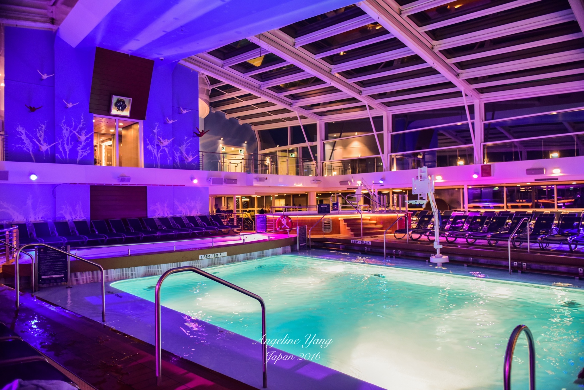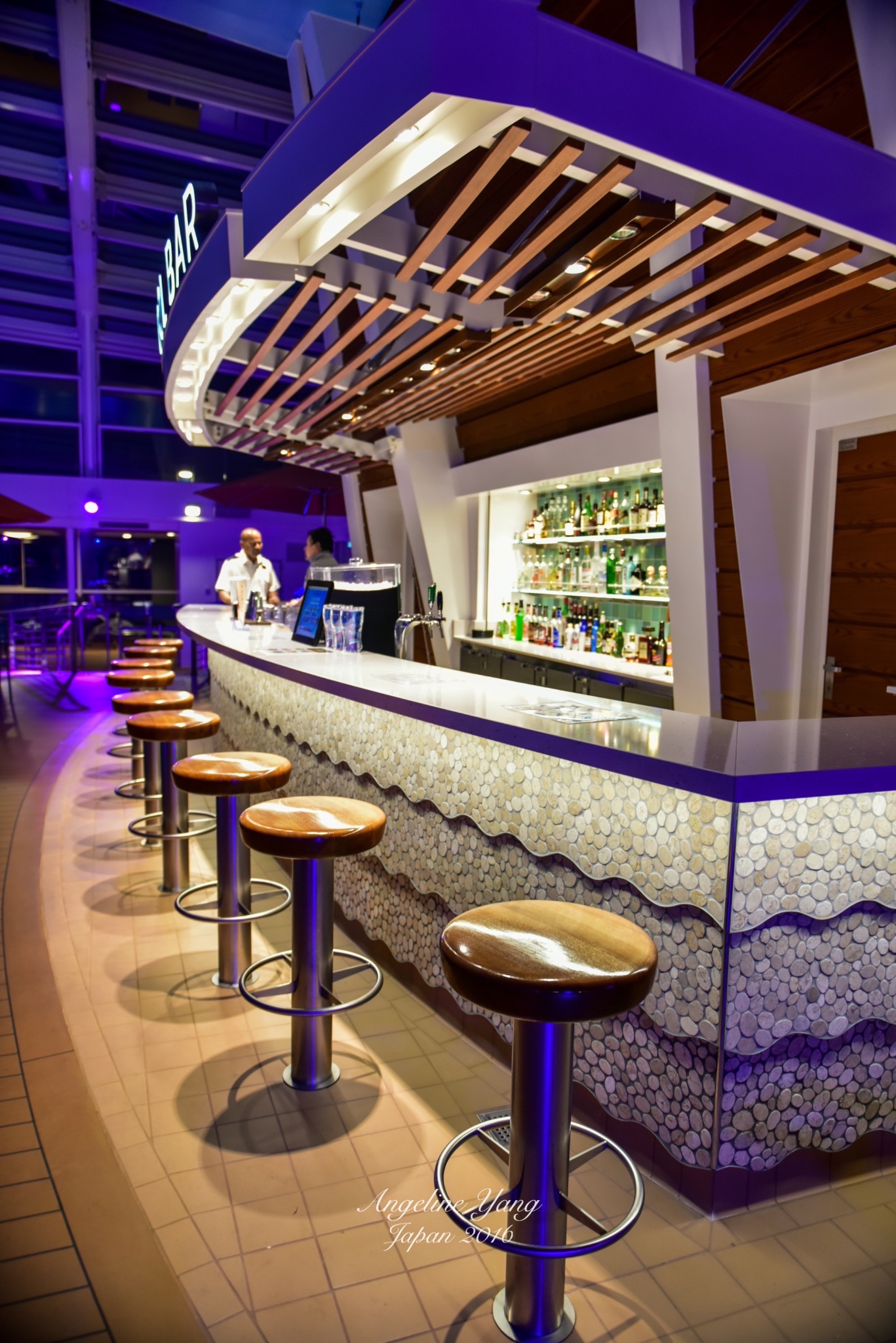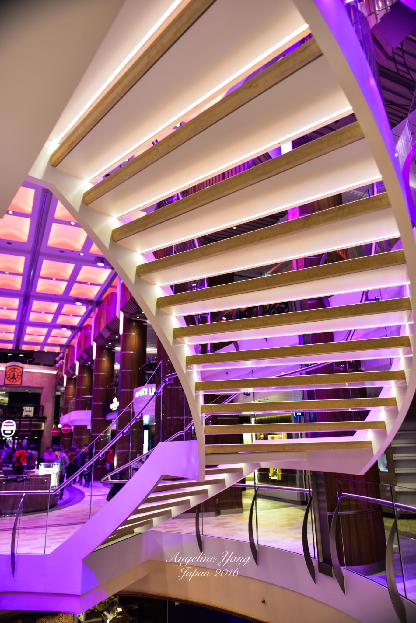 这部弧度优美的楼梯连接商场和赌场,都是花钱的地方,到处都是魔鬼。服务中心超多人的,大家都在排队绑定信用卡,这样的话就不用随身带着了,只要一张房卡就搞定所有消费,全部是美金结算哦。每个泳池边都有bar,不用担心游着游着泳突然口渴的问题啦,随时随地用房卡去来一杯冰啤或鸡尾酒。游累了还可以去SPA中心做个脸按个摩,更夸张的是还有发型设计,染发烫发,和打玻尿酸肉毒,邮轮之旅可以帮你彻底改头换面而又神不知鬼不觉,小心回去老公都不认识了,哈哈。对了,四楼还有免税店卖