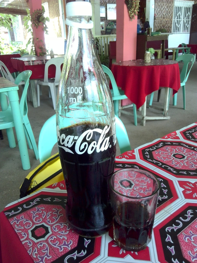 至于饮料,当然要数芒果沙冰,东南亚的芒果沙冰都不错,泰国的性价比最高,菲律宾的更浓稠一些,GING GING也有出售,80P一杯,但是,天天喝,你也会腻的,这里推荐一款可乐,对,是可以,1升装,玻璃瓶,60P。算是性价比较高的饮料,要知道,岛上的物资都要从宿务岛运过来,物价不低,一个易拉罐的可乐都要35P一罐,60P一瓶1升装的可乐算很划算了,而且这还是在餐厅,比天朝厚道多了~~~