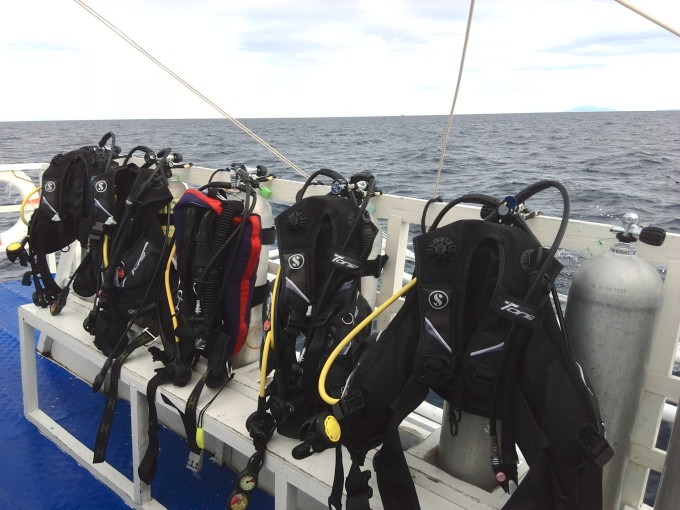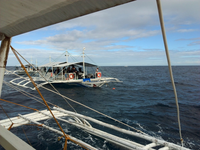 第二天开始,连着三天4点起床去看长尾鲨,也是这次行程的重头戏,到达潜点天已经亮了,海面上停着一堆螃蟹船,你懂得,海里人比鱼多,我连着2天,啥也没看到,第三天人品爆发,不但看到了三条长尾鲨,在做五米三分钟停留的时候,还看到了鹰鳐。嘿嘿,对了,告诉你们一个小套路,千万不要用高氧,因为,去长尾鲨潜点的人大多都是高氧,如果只有你不用,那么潜店会单独给你派一个DM,我就是三天一直享受一对一VIP服务的。嘿嘿,心机男~