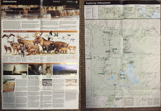 2. 公园地图:每进入一个公园,门口的检票亭都可以免费领取一份地图小册子。这个小册子很有用,上面不仅有公园地图,还有公园介绍,可以怎么玩儿,能看见什么野生动物等等。如果检票亭发放完了,也可以到游客中心领取。下面就是黄石国家公园的地图小册子展开正反面,还是有很多有用信息的
