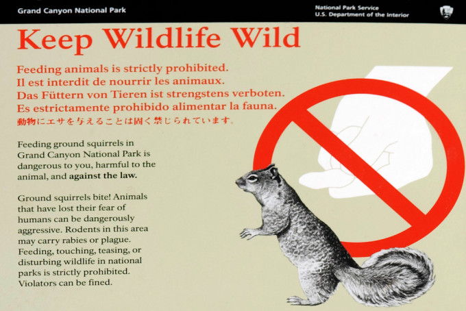 5. 保护野生动物也保护自己!对野生动物,不可以接触更不可以投喂食物!要保持野生动物的野性(Keep Wildlife Wild!这个标志随处可见)!不要以为松鼠、野兔和鸟类这些小动物就是安全的,亲密接触或被咬伤可能会引发破伤风、鼠疫、狂犬病和禽流感等疾病!而且给野生动物喂食,会使他们丧失自然的捕食能力,进而退化,对喂食行程依赖后更会对人类行程困扰。所以,切记切记,不要接触和投喂!另外,有熊出没的公园都配有防熊垃圾桶,一定要保管好各种食物,注意密封,垃圾要丢弃到防熊垃圾桶内。因为,熊的嗅觉灵敏,食品暴露会招来熊的攻击,一旦熊发现了人类是获得食物的方便来源,就会经常攻击人类,而这种学会了攻击人类的熊就会被公园的工作人员捕杀,以避免危险!所以,保管好食物既是保护自己,更是保护动物!