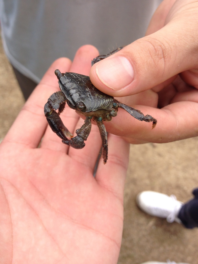 我们在野狸岛时候在某处岸边抓螃蟹,但是螃蟹们太狡猾了,我一个也没有抓到,这个是一个小萝莉抓到的,我借过来拍照的,表示抓到了螃蟹。