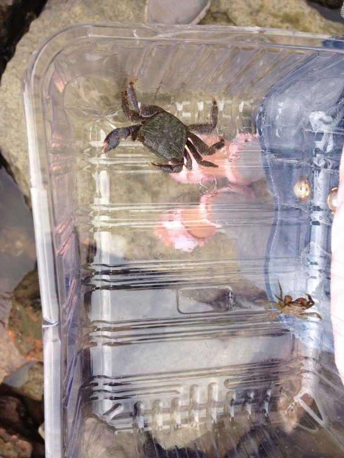 看,我们同伴抓到一个小螃蟹。