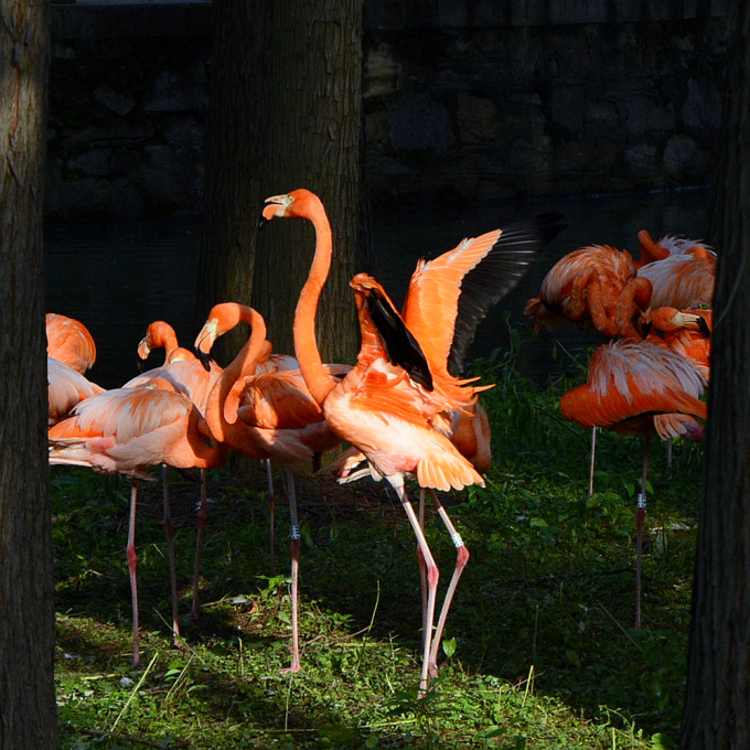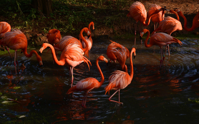 红鹳鸟(火烈鸟)在夕阳的照射下,变得更加火红。