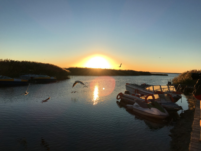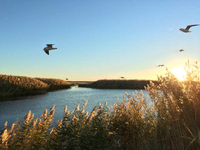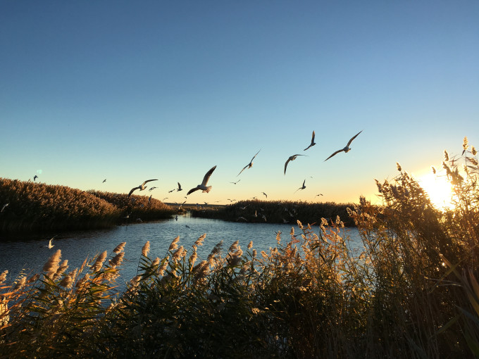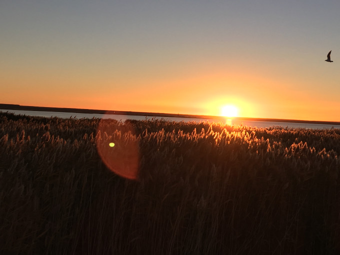居延海日出:太阳缓缓从地平线升起,金色芦苇在风中轻轻摇曳,海鸟在空中自由飞翔,自然而和谐。