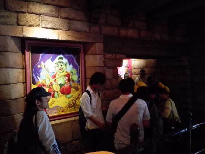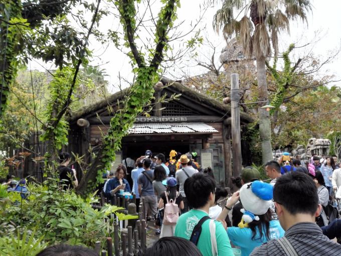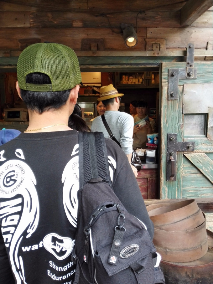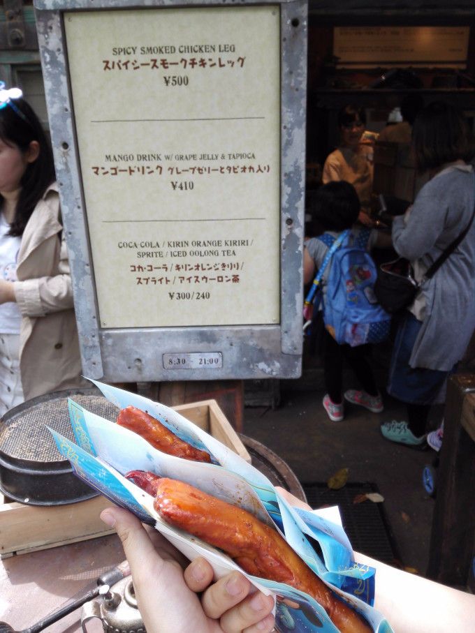 然后这里顺带再讲个插曲。就在暴风骑士旁边有个鸡腿店,据说是园区里最好吃的鸡腿,排队人数也有几十人(在迪士尼里面买支水都要排队),大概要排个7分钟,价格为500yen,味道确实很不错!我们建议如果想玩多点项目的小朋友就还是吃这些小吃吧!如果是餐厅,排队人数一点不亚于一个热门项目~