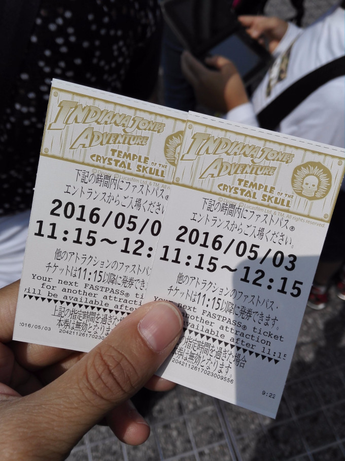 拍完照后时间刚好差不多拿第二张FP,于是我们便往里走去拿距离最近的失落河三角洲拿印第安纳琼斯的FP,9:20踩点拿到,显示要11:15-12:15才能玩,并在11:15后可拿第三张FP。