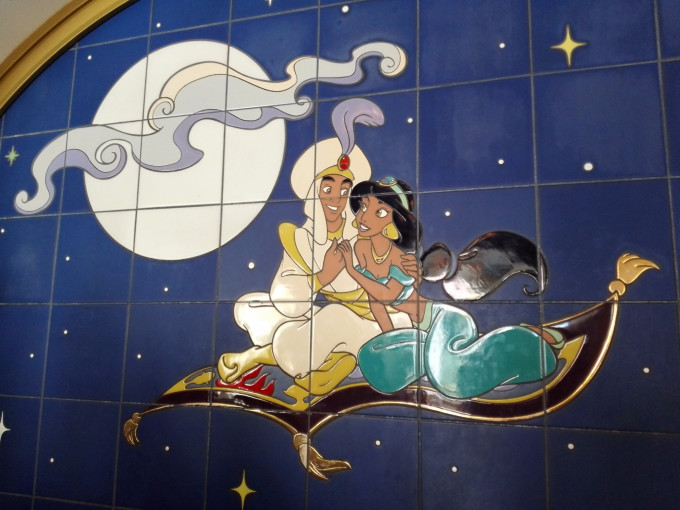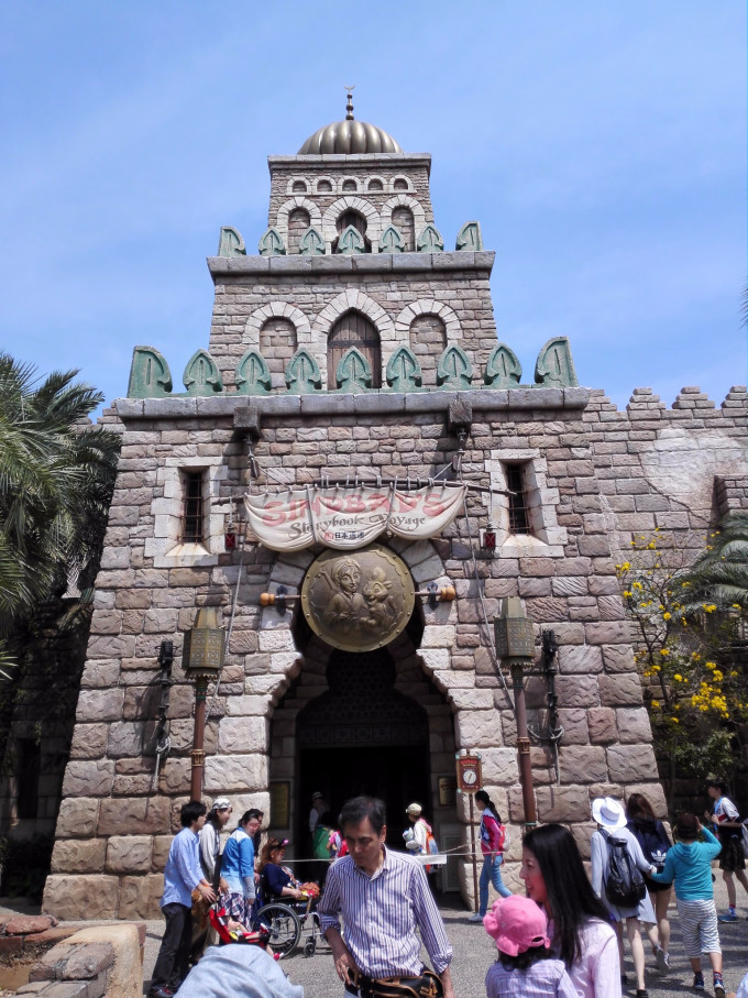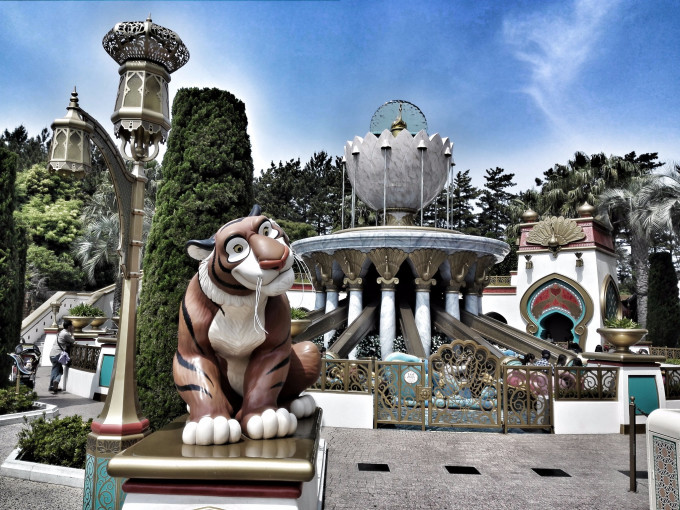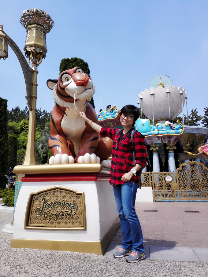 拿完印第安纳琼斯的FP回去玩第一个热门项目:风暴骑士,由于前戏较足,玩完已经将近10点,我们去到阿拉伯海岸,看到茉莉公主飞天魔毯不需排队,虽然比较小孩,但也玩了一下下~还在门口拍了些照片,嗯,饭团在摸老虎胡子!
