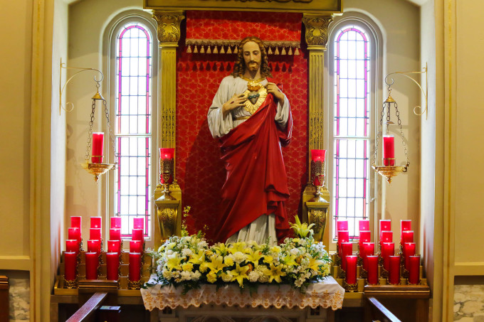 耶稣圣心:耶稣裸露的心脏,绕着茨冠,带着伤痕,冒着火焰,它象征着耶稣对世人之博爱。令我想起了巴黎的圣心大教堂。