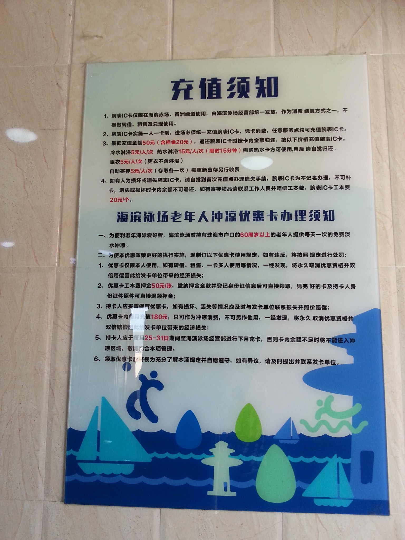 办理了腕表IC卡并充值后,可在海滨泳场所有消费场合刷卡使用,包括洗浴、寄存、超市购物等。腕表IC卡实施一人一卡制,最低充值金额为50元(含押金20元),退还腕表IC卡时,余额按照卡内金额归还。