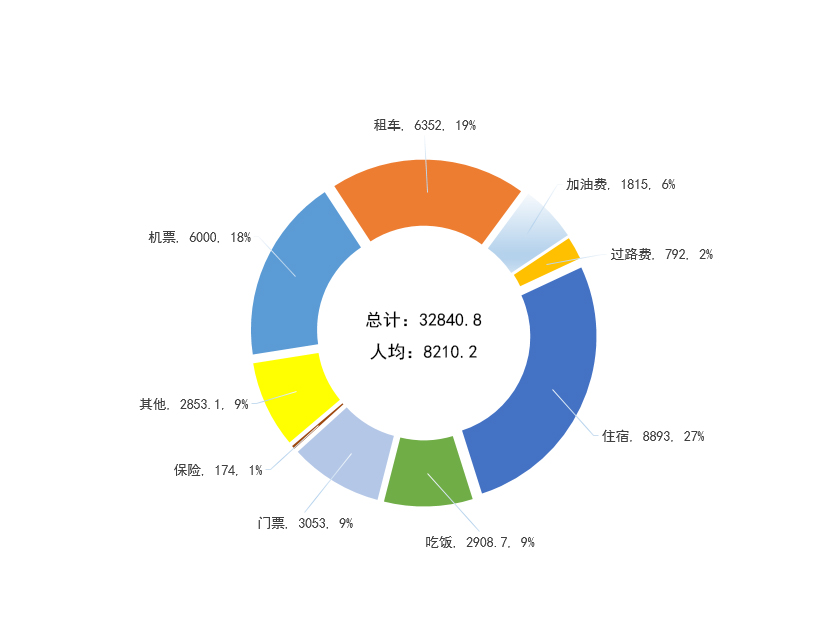 主要支出是来回的大交通、 租车 和住宿,“其他”费用中包括了超市购物、沙地摩托、雅丹越野车、导游讲解等等。
