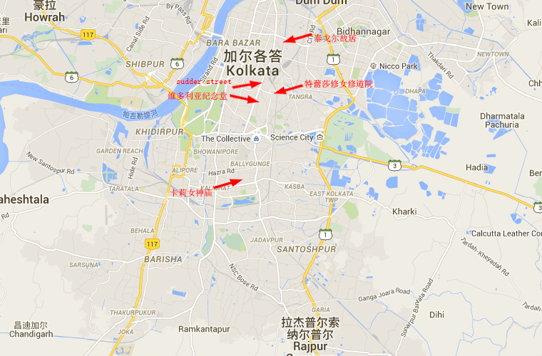 以上为GOOGLE的加尔各答城区截图,我主要去了这么几个地方,sudder street是加尔各答背包客聚集区,也就是青旅聚集地。以sudder street为中心,向东步行20分钟可以到达特蕾莎修女的仁爱之家,向南方步行40分钟,约3公里可以到达维多利亚纪念堂。最远的正南方是卡莉女神庙。东北方较远的地方是泰戈尔故居。这几个地方是我在加尔各答一天的行程。(地图表示并不精准,之能做大概位置参考,请自行google地图,最为精准)