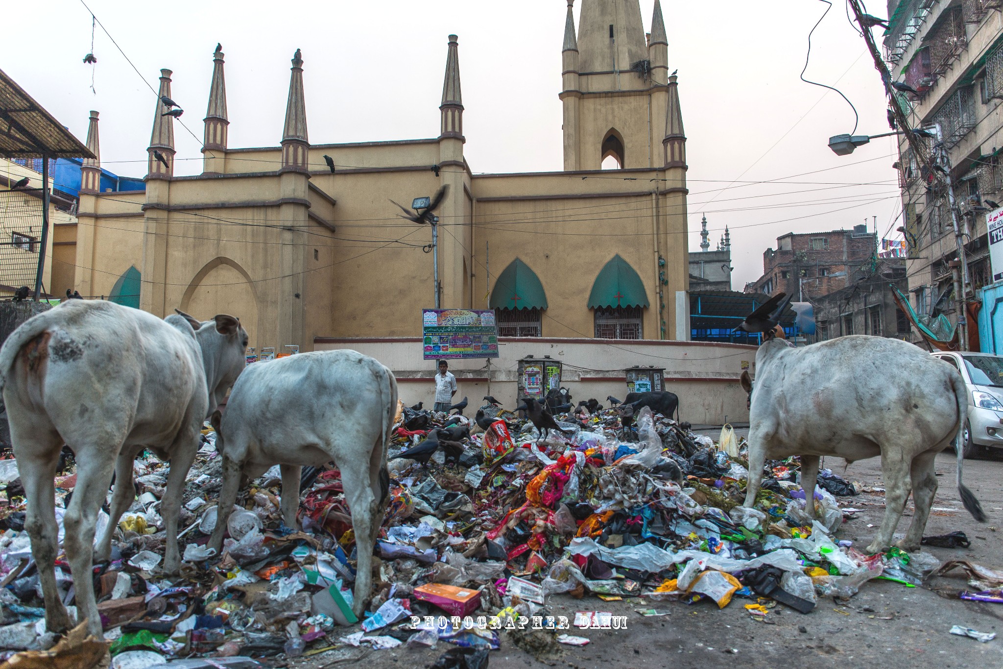 一个主路口堆满了垃圾,神牛,乌鸦,野狗,正在吃早点。