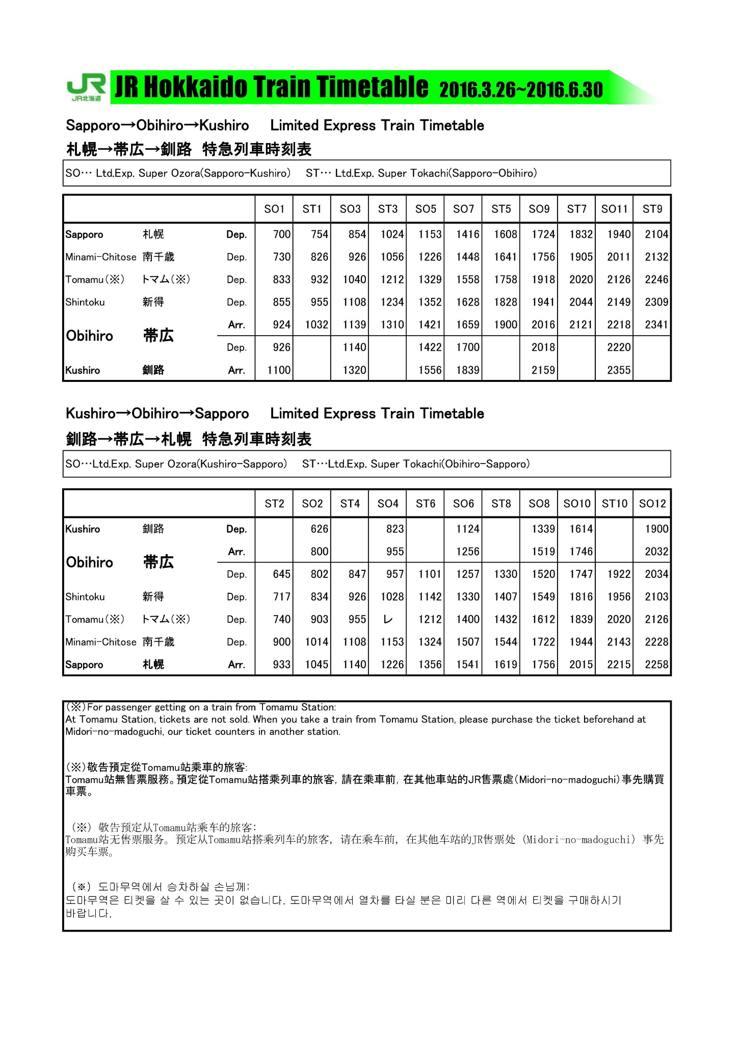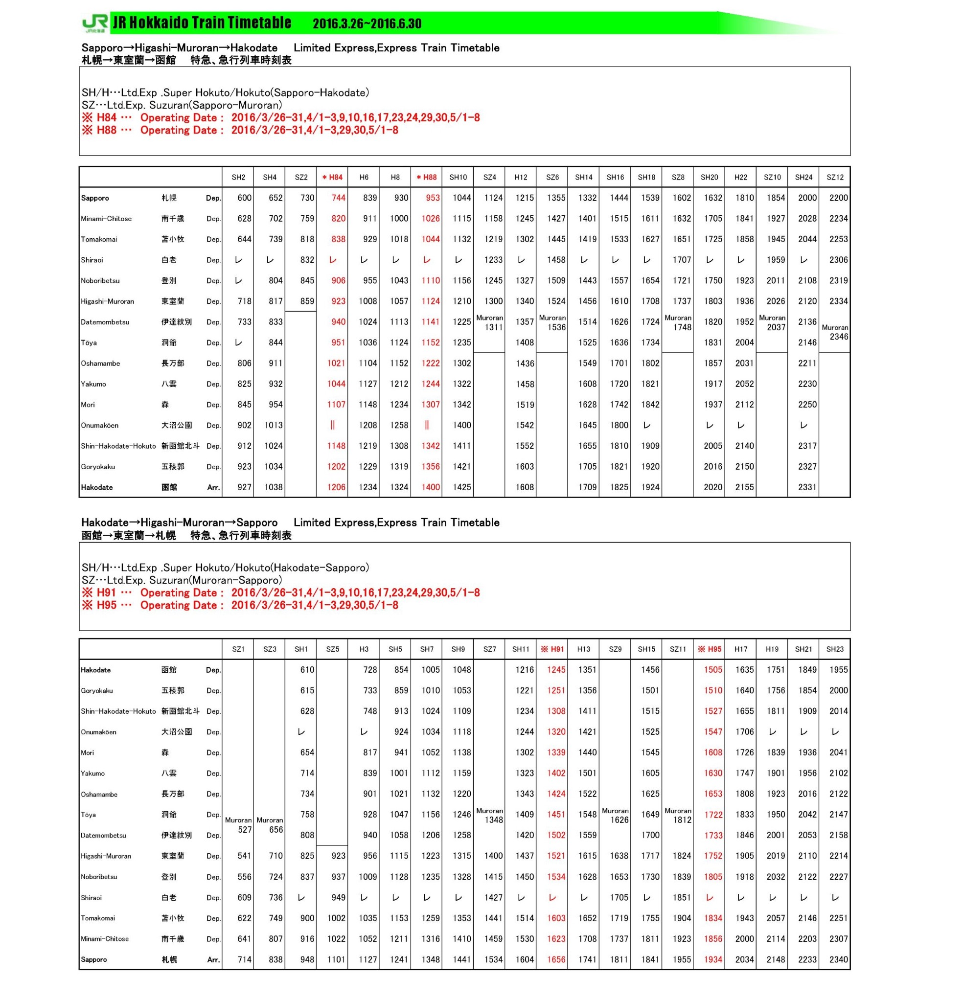 附上我们此次行程的JR时间表供大家参考,别的路线官网也有列示,稍后奉上JR北海道官网
