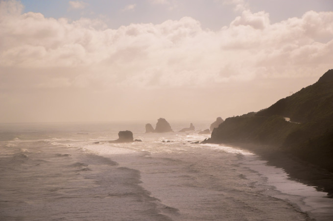 从格雷茅斯去薄饼岩的路上,路过的海边,远处的浪花溅起的水雾,产生了这样梦幻般的效果~~