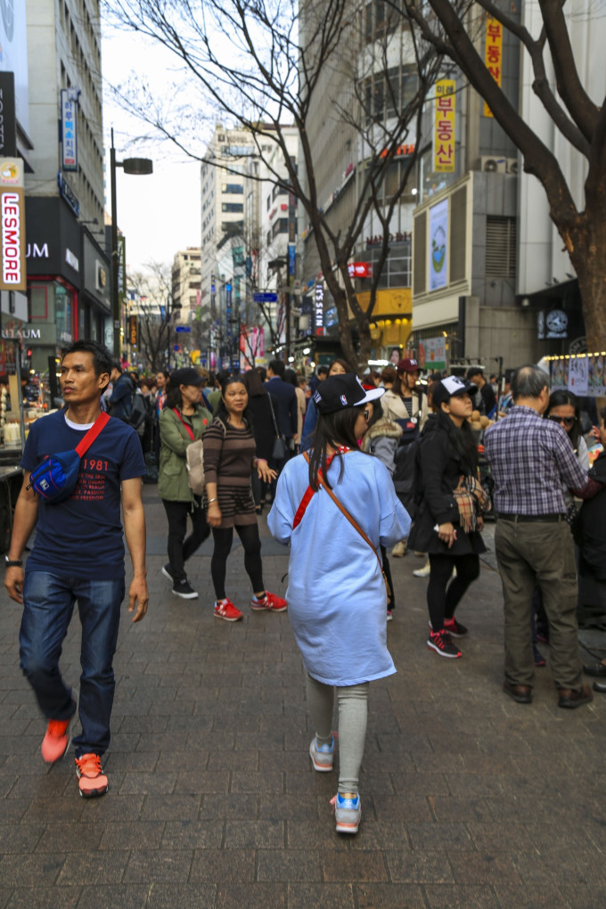 等从酒店出来已经是下午三点多了,决定在明洞里走走,然后去觅食,一路走走看看,给我印象最深的有两个,一个是这里卖的东西确实要比国内的样子什么的潮一点,尤其是各种品牌的运动鞋,还有就是韩国的小姑娘都真心扛冻,四月初的天气,我还穿着风衣,这里的女孩们光着大腿穿短裙的就大有人在了。