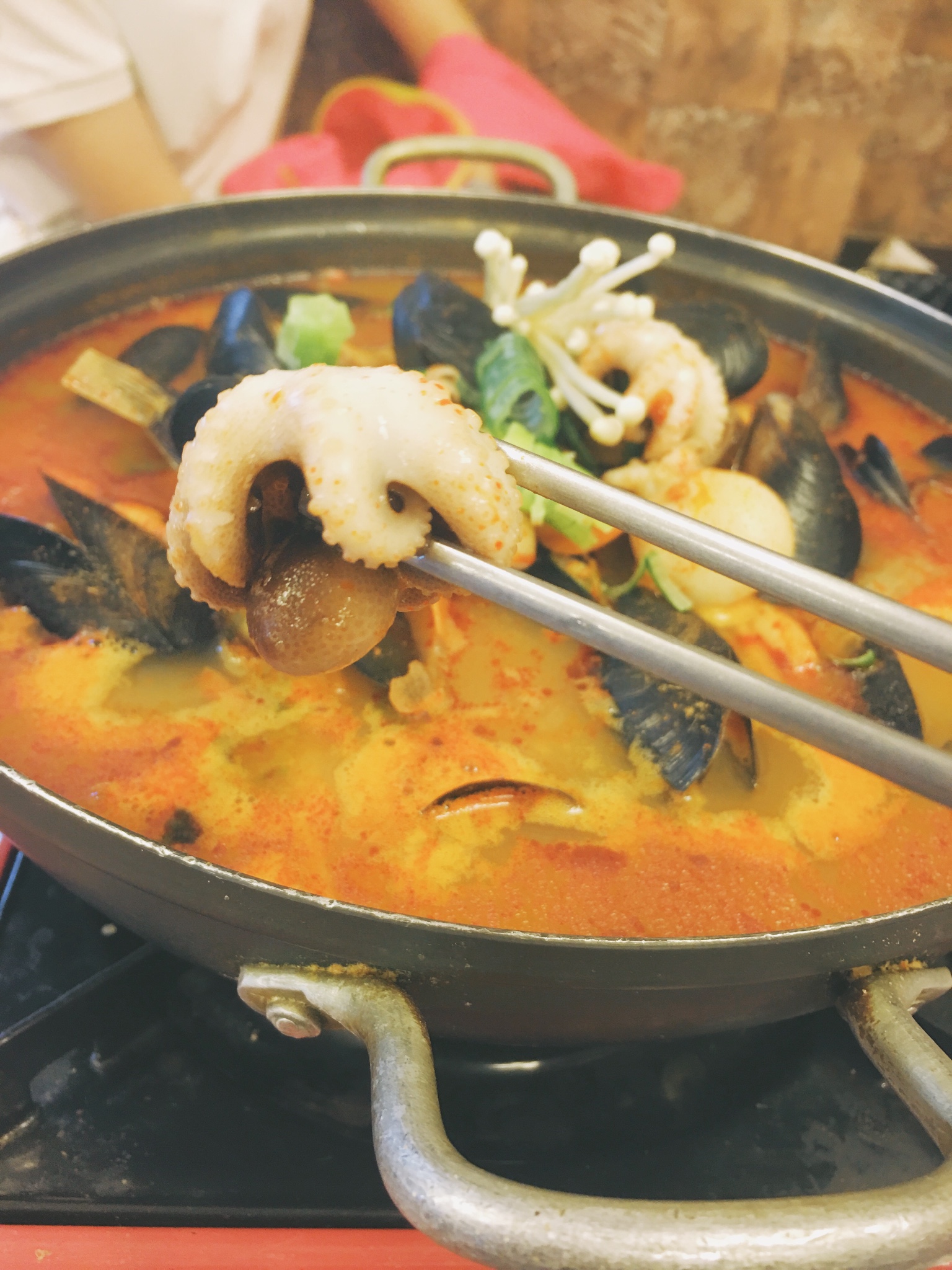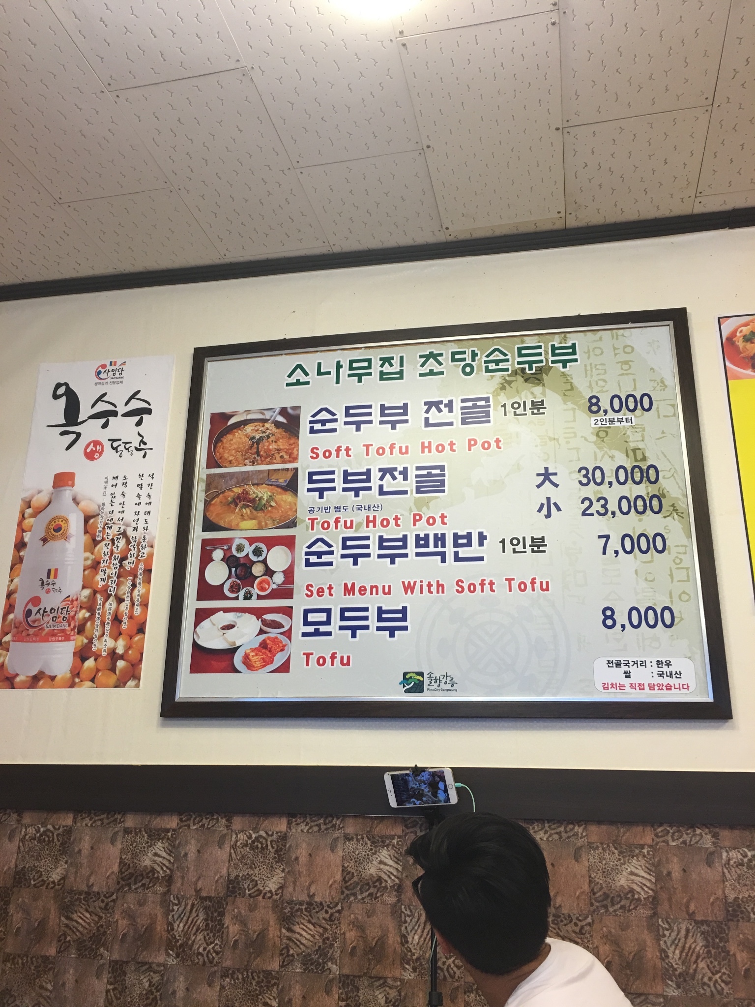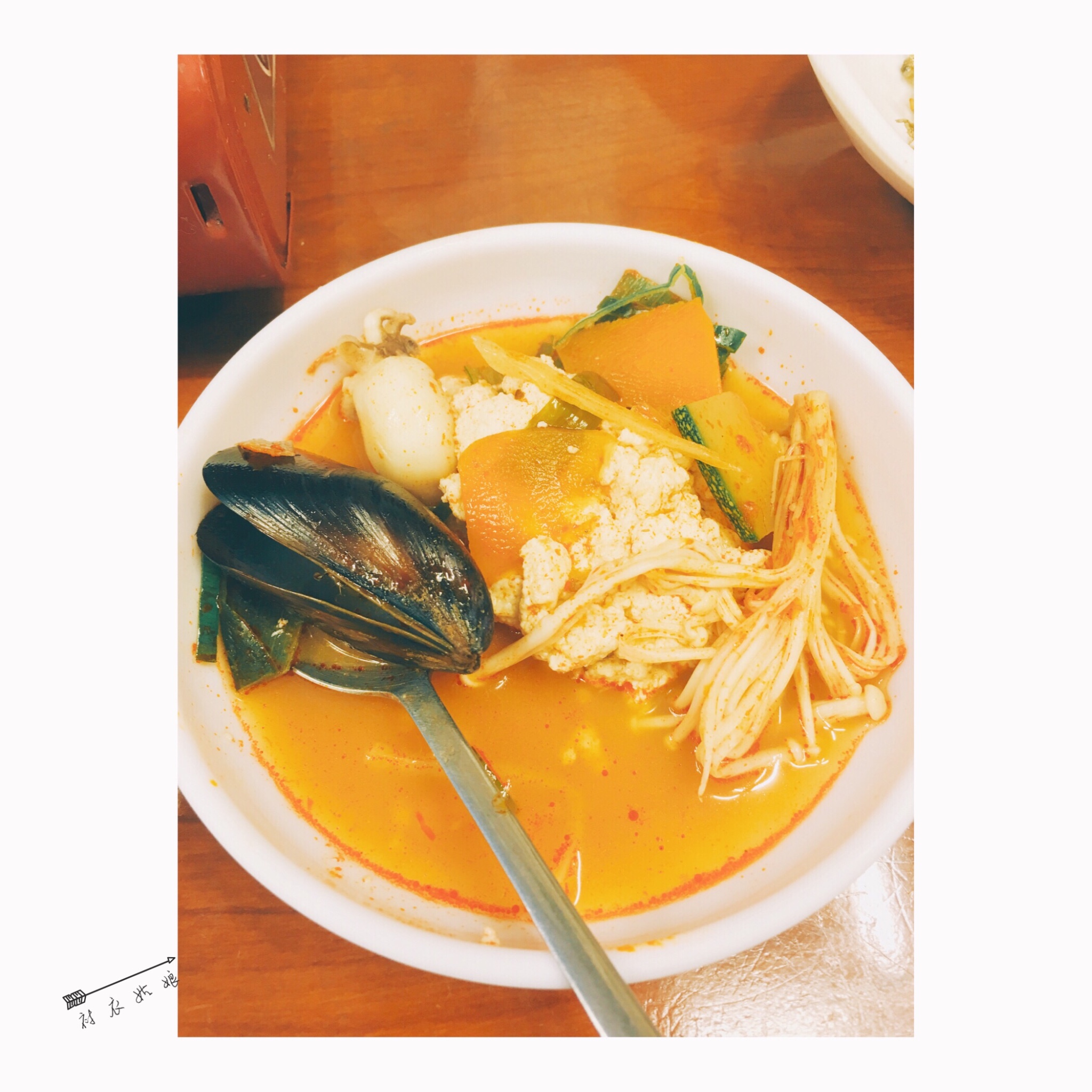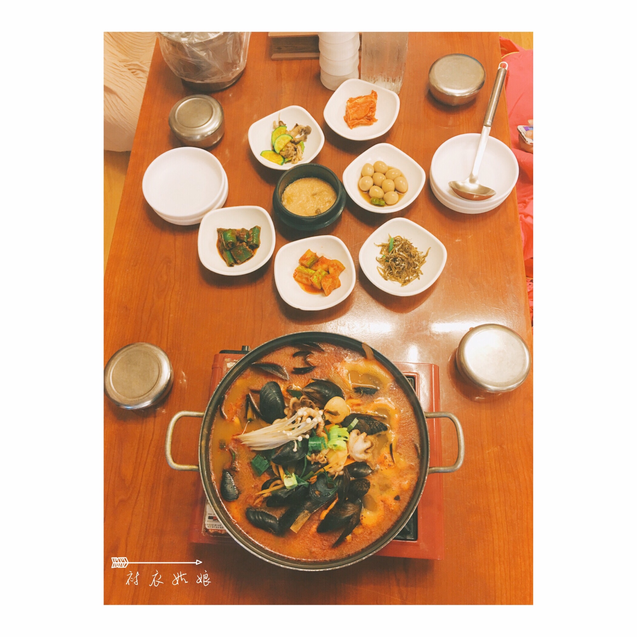 中餐吃的是韩国传统的海鲜豆腐锅 韩过传统饭店最具特色的就是小菜很多 这个豆腐锅有辣的和不辣的两种 价格表拍了下来有图的菜单对于境外人来讲很方便哦