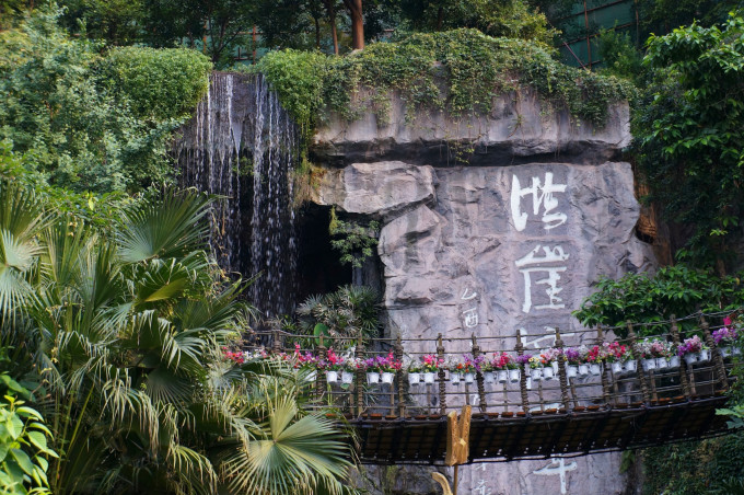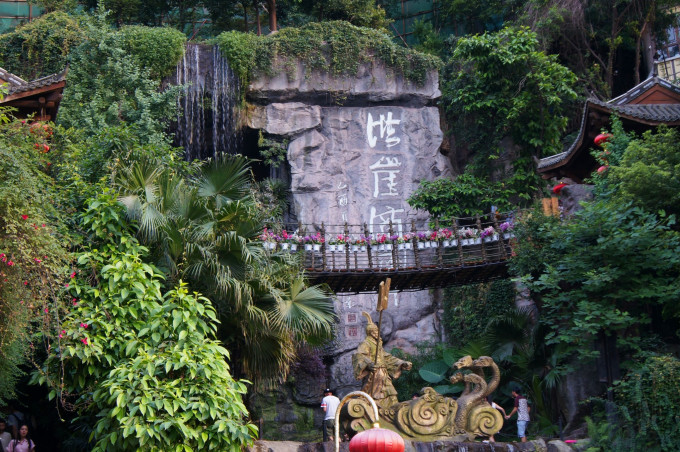 往上爬了一小段路之后就到了真正的“洪崖洞”,没错,洪崖洞就是一个山洞,还可以看到一个不大不小的瀑布,给人一种水帘洞的感觉。