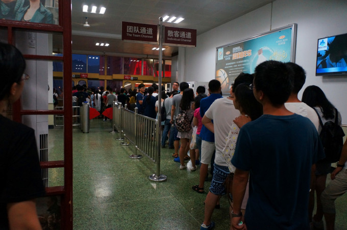在走到长江索道的时候,我们又被眼前的一幕震惊了,排队已经排到了外面,正当我们犹豫是不是要先去吃好晚饭再来的时候发现队伍行进的速度倒还是挺快的,于是我们就开始排队了。
