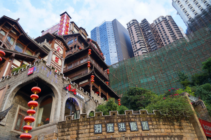 现代的高楼大厦和古色古香的洪崖洞放在一张图片里,让人仿佛有一种时空上的穿越感。