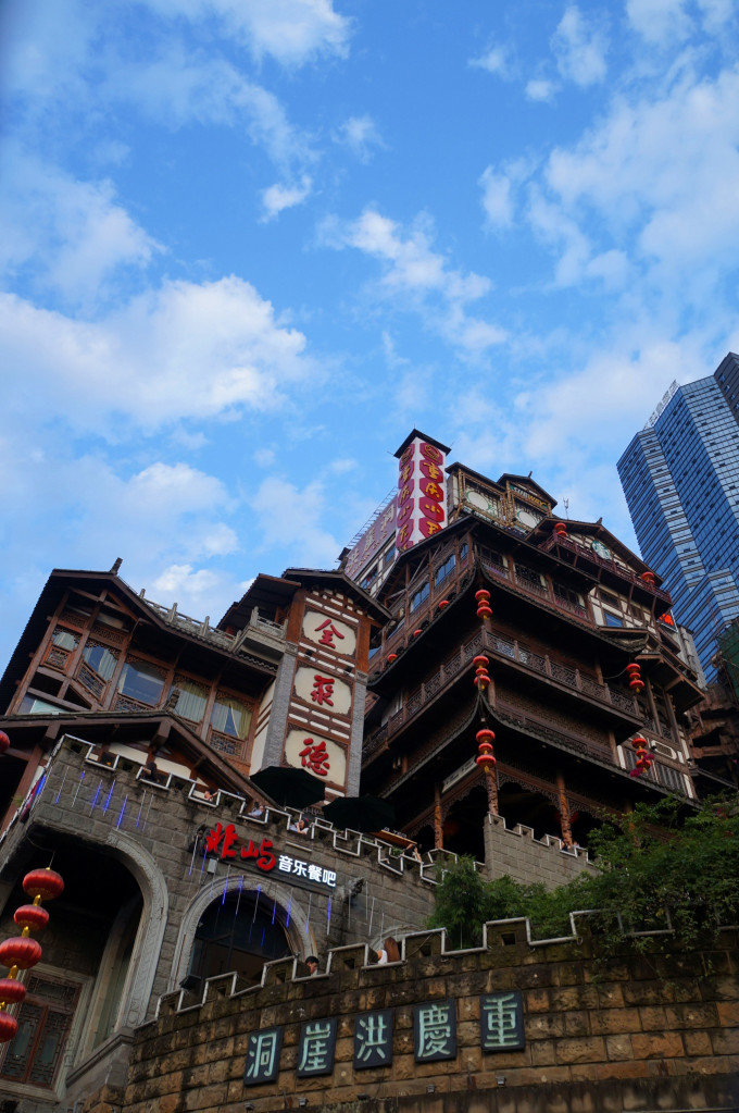 据说最适合观赏洪崖洞的时间是晚上,但由于我们晚上还要去搭乘长江索道,因此我们只能把参观洪崖洞的时间安排在了瓷器口之后。好在白天去洪崖洞也是有好处的,此行我并没有携带专门拍夜景的镜头,白天去的话,拍出来的照片还清晰一点(不知道算不算是一种自我安慰)。
