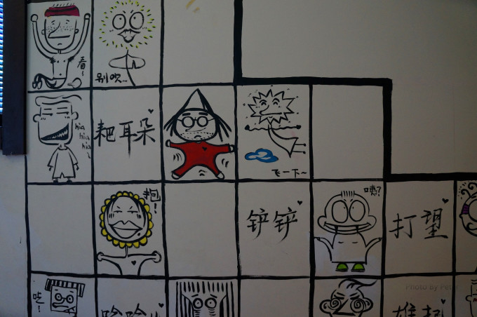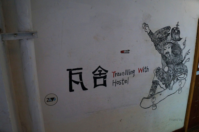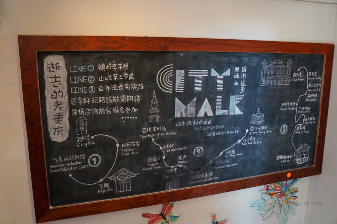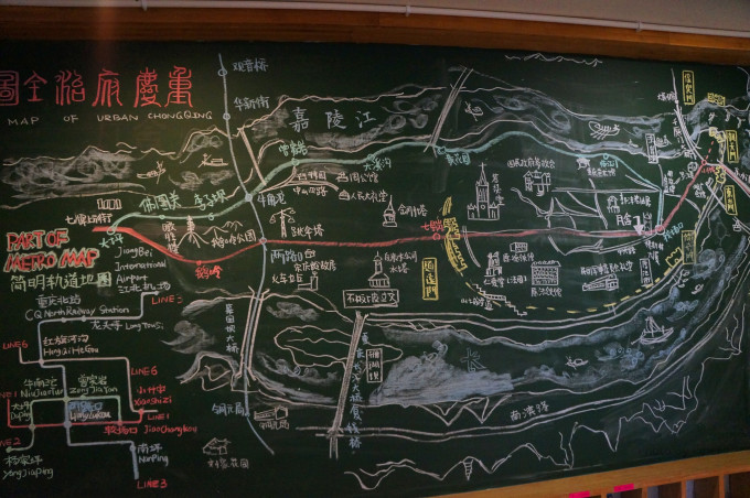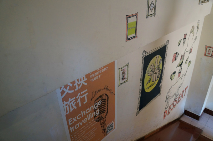 瓦舍青年旅舍在4楼,上去的时候没有电梯,只能靠两条腿走上去,一路上去是各种各样的涂鸦,有重庆地区的旅行手绘图,重庆徒步路线图,还有重庆地区的方言介绍,看得我们那叫一个眼花缭乱。