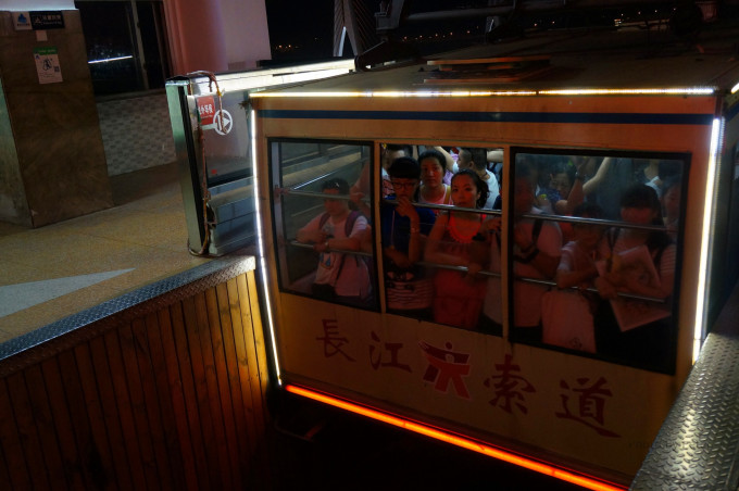 我们以为排队的队伍就眼前那么长,实际上天真的我们犯了一个很大的错误,队伍仅仅是在门口,离购票处尚且还有段距离,买好票之后还要再上二楼,排了足足一个小时的队我们才终于成功搭乘上了长江索道,索道的缆车就像一个大铁罐子,不过倒是让看过《疯狂的石头》有着非比寻常的亲切感。