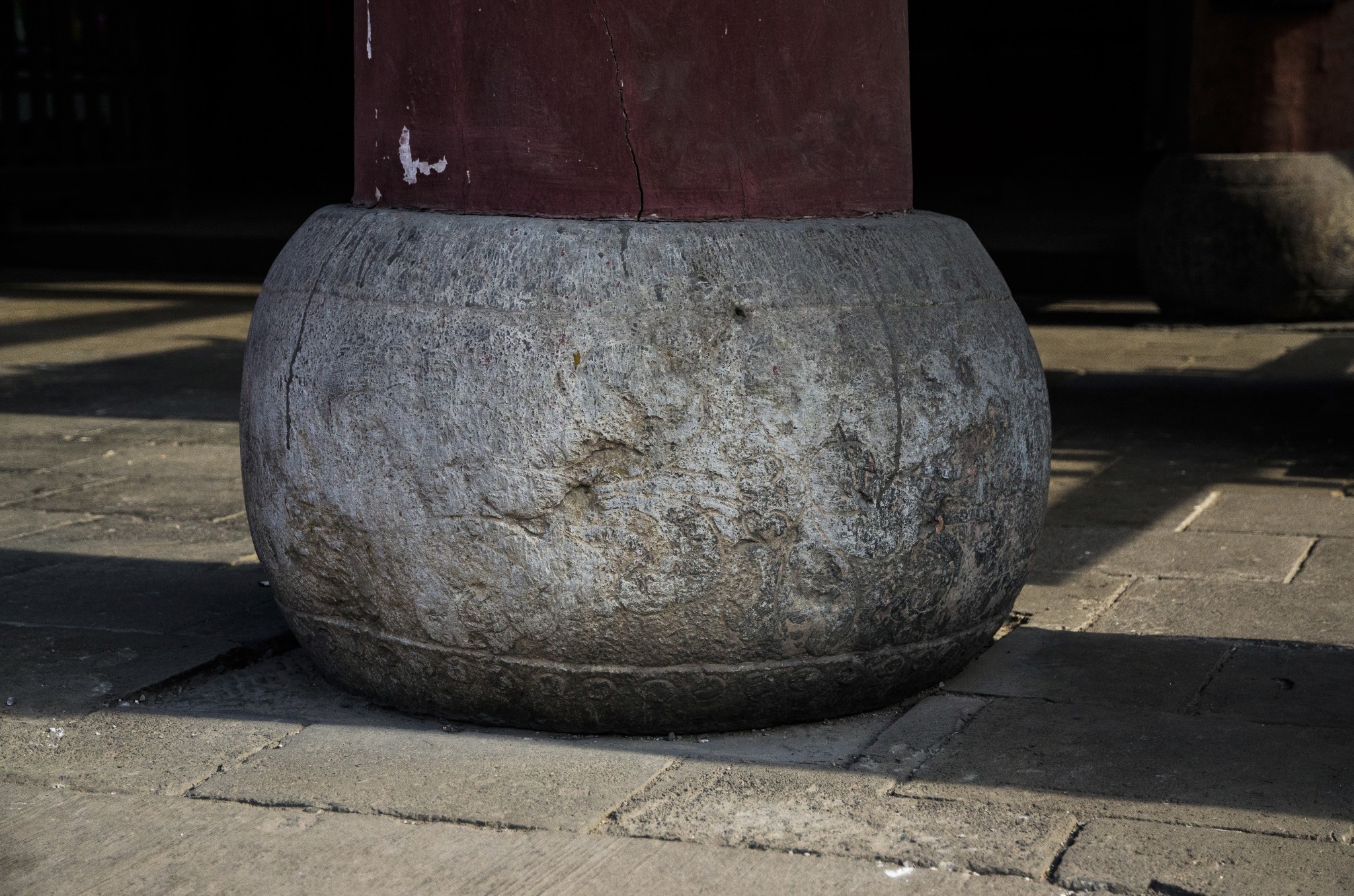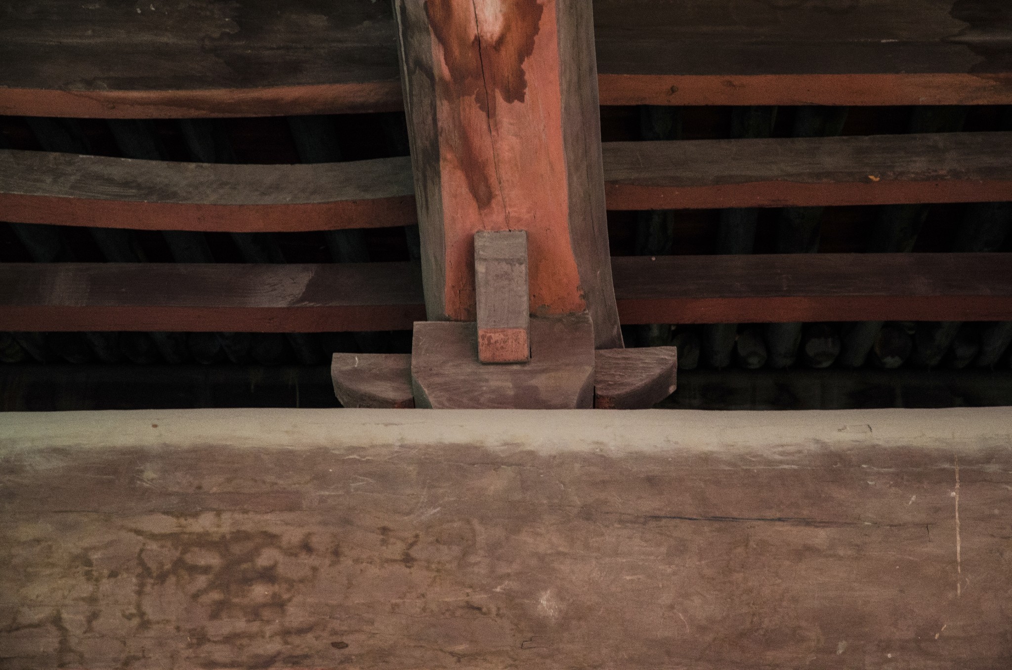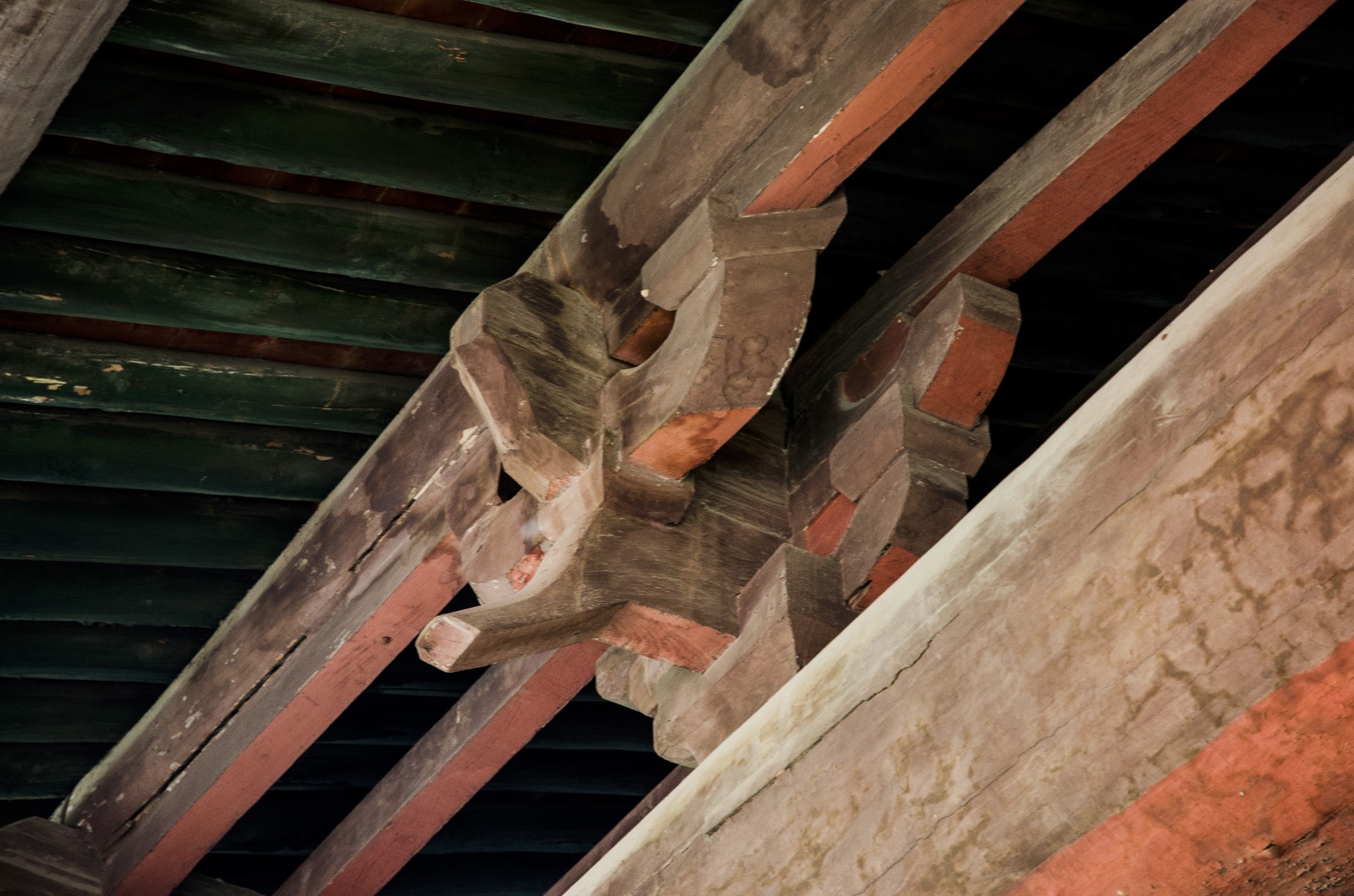 四柱之上,阑额、雀替纤弱,其上承托着一整根极大的普柏枋。