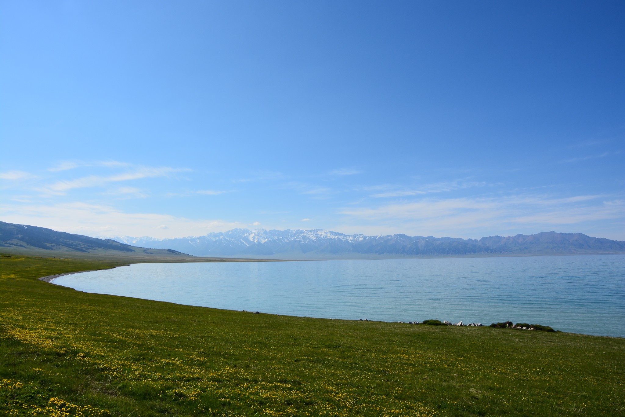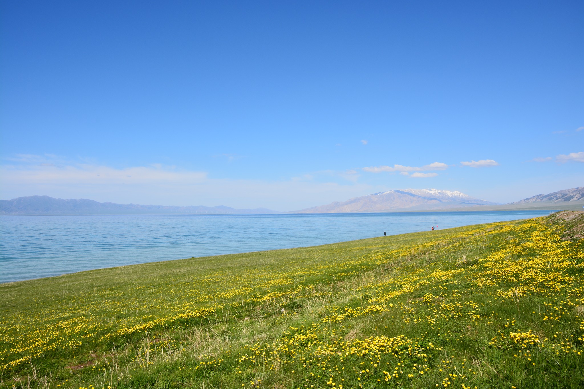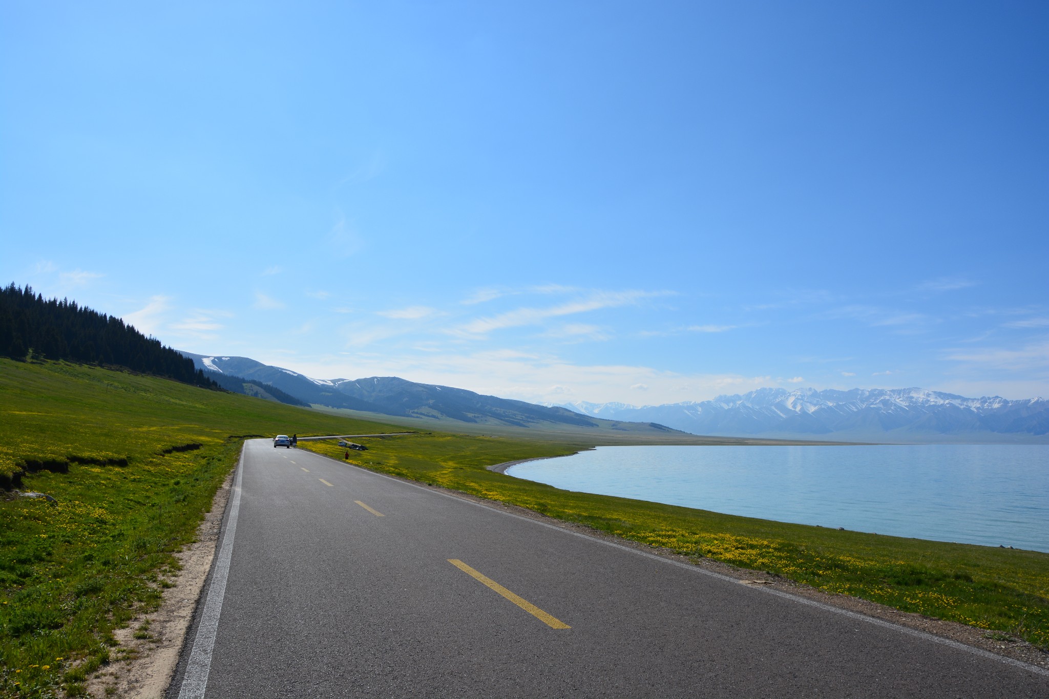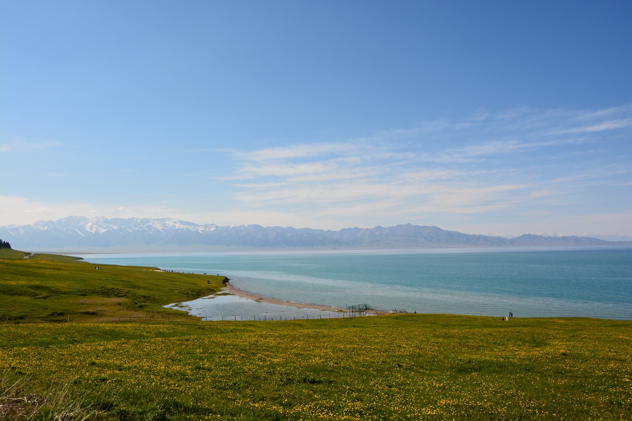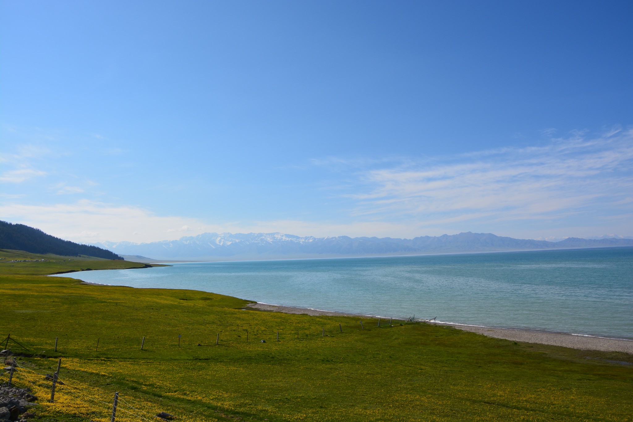 沿着连霍高速纵情奔驰,当高速公路两侧出现大量风力发电机的巨大机组时,本次伊犁行程的第一个目的地,赛里木湖,就已默默守在道边不远处,静候我们这些唐突而来的拜访者。雪山下一汪碧蓝的湖水波光粼粼,湖面掠过几只鸥鸟,翻飞起伏,湖边黄白相间的野花在清新的湖风中轻轻摇曳。此情此景,像极了一位久居深闺的脱俗女子,悄悄打开二楼的绣窗,有些羞涩又有些期待地打量着街巷上的人和物,渐渐的,她沉浸在自己的心事里,默然无语,却未曾意料到,在川流行人的眼中,她才是那道最靓丽的风景。