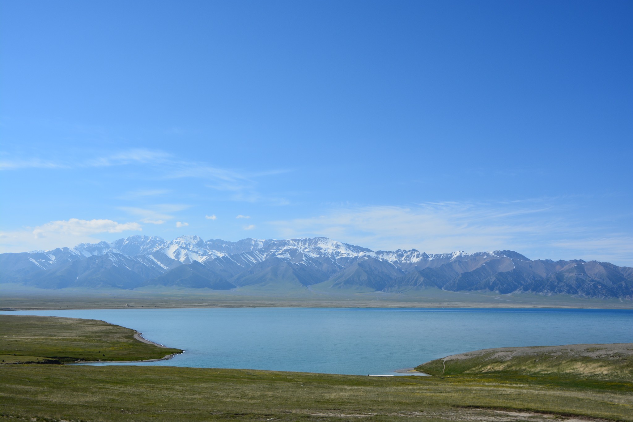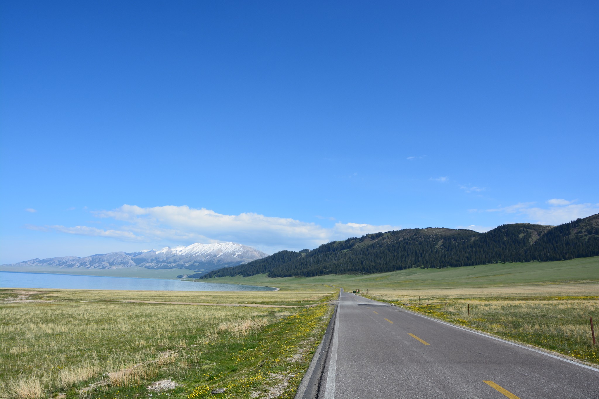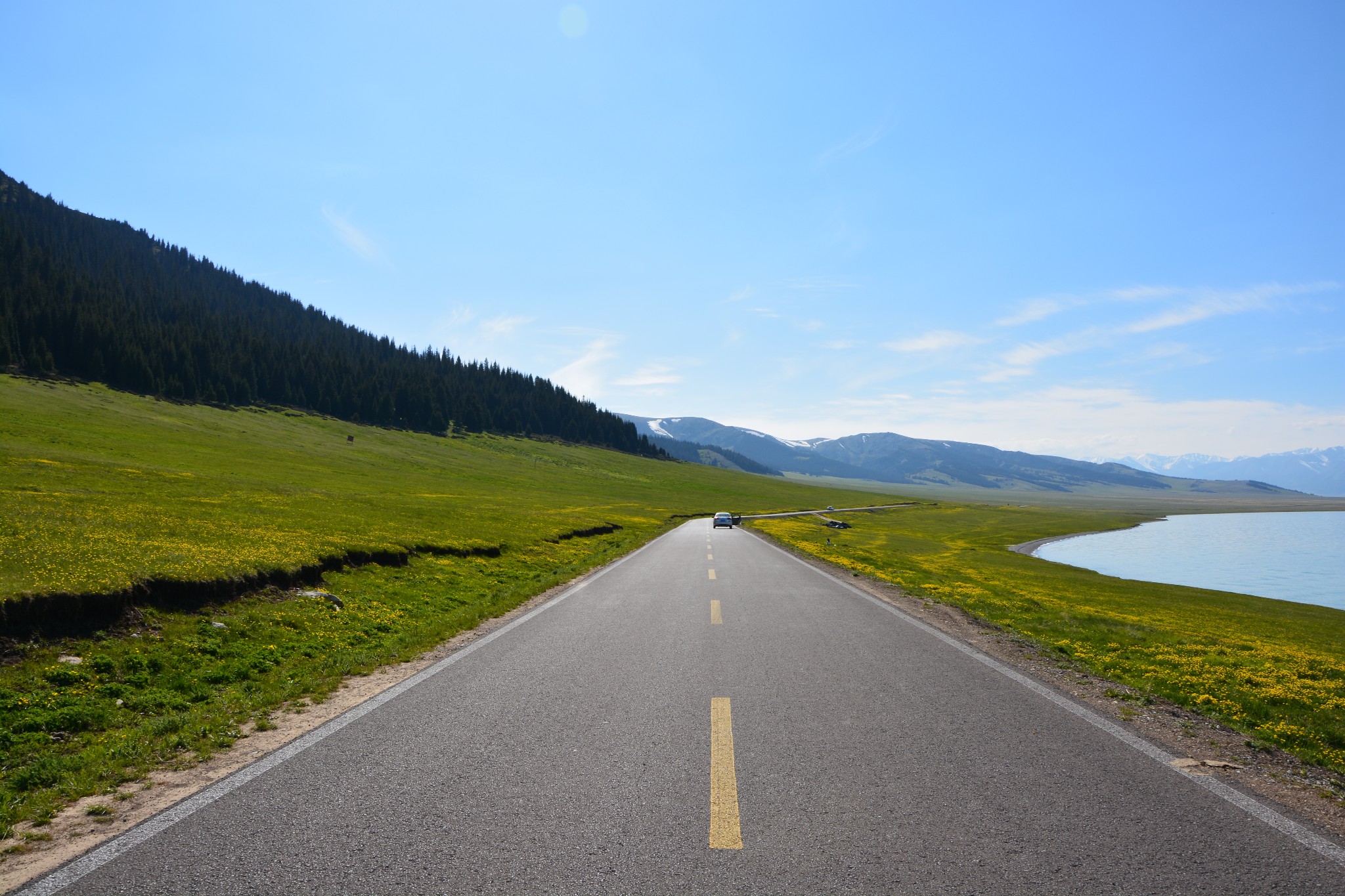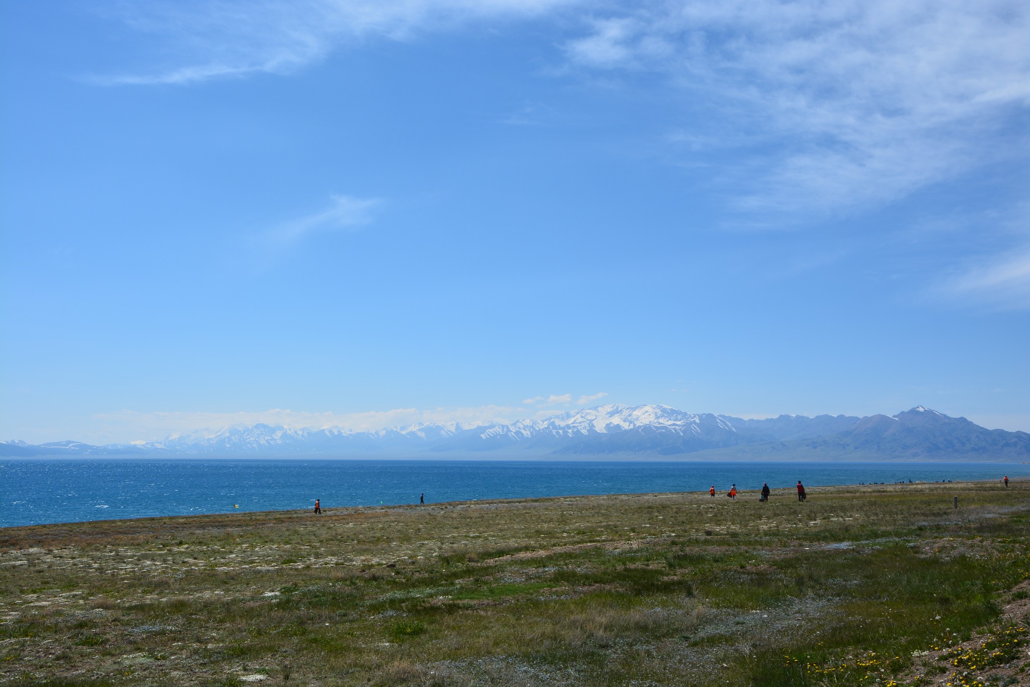 沿着连霍高速纵情奔驰,当高速公路两侧出现大量风力发电机的巨大机组时,本次伊犁行程的第一个目的地,赛里木湖,就已默默守在道边不远处,静候我们这些唐突而来的拜访者。雪山下一汪碧蓝的湖水波光粼粼,湖面掠过几只鸥鸟,翻飞起伏,湖边黄白相间的野花在清新的湖风中轻轻摇曳。此情此景,像极了一位久居深闺的脱俗女子,悄悄打开二楼的绣窗,有些羞涩又有些期待地打量着街巷上的人和物,渐渐的,她沉浸在自己的心事里,默然无语,却未曾意料到,在川流行人的眼中,她才是那道最靓丽的风景。