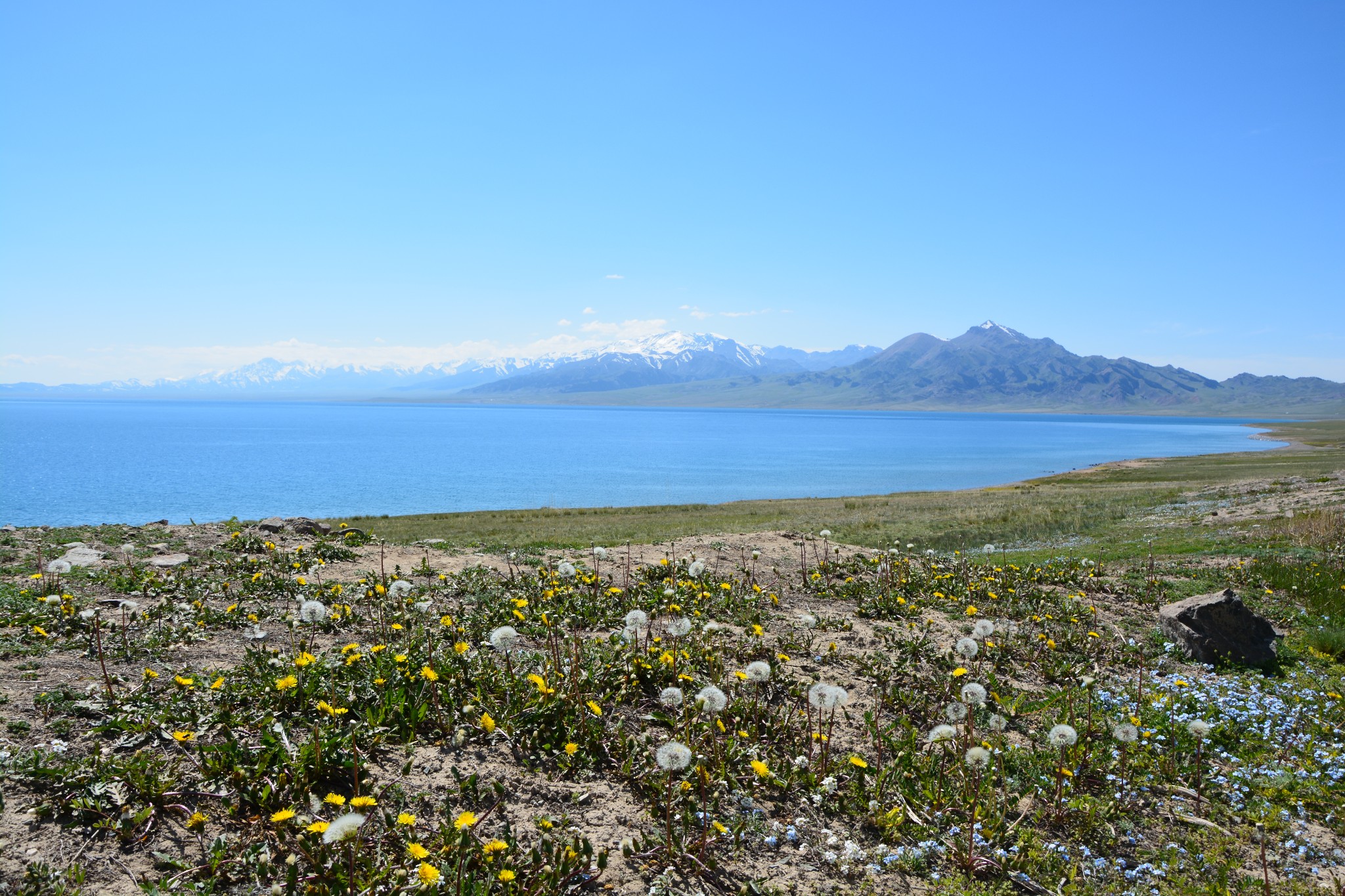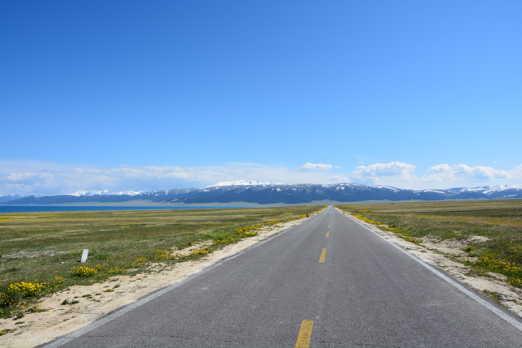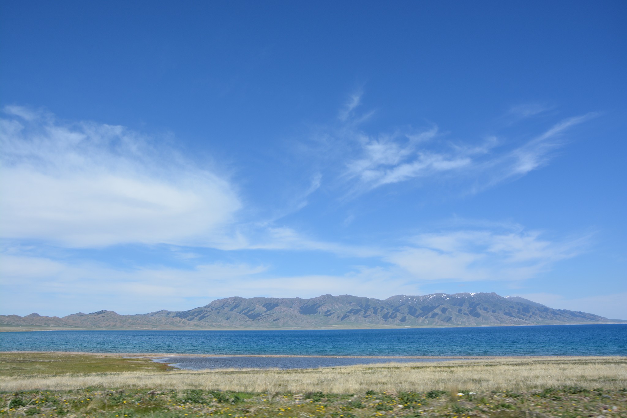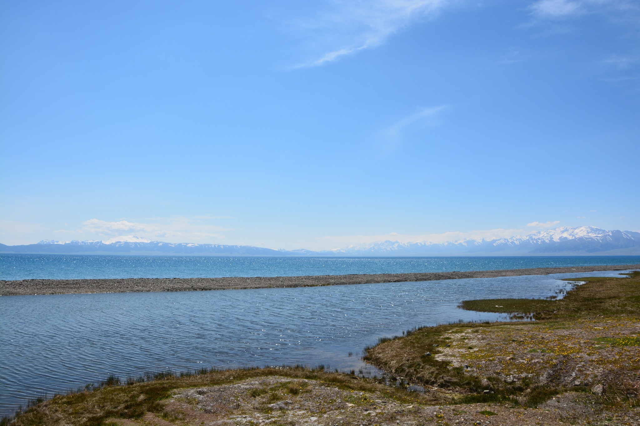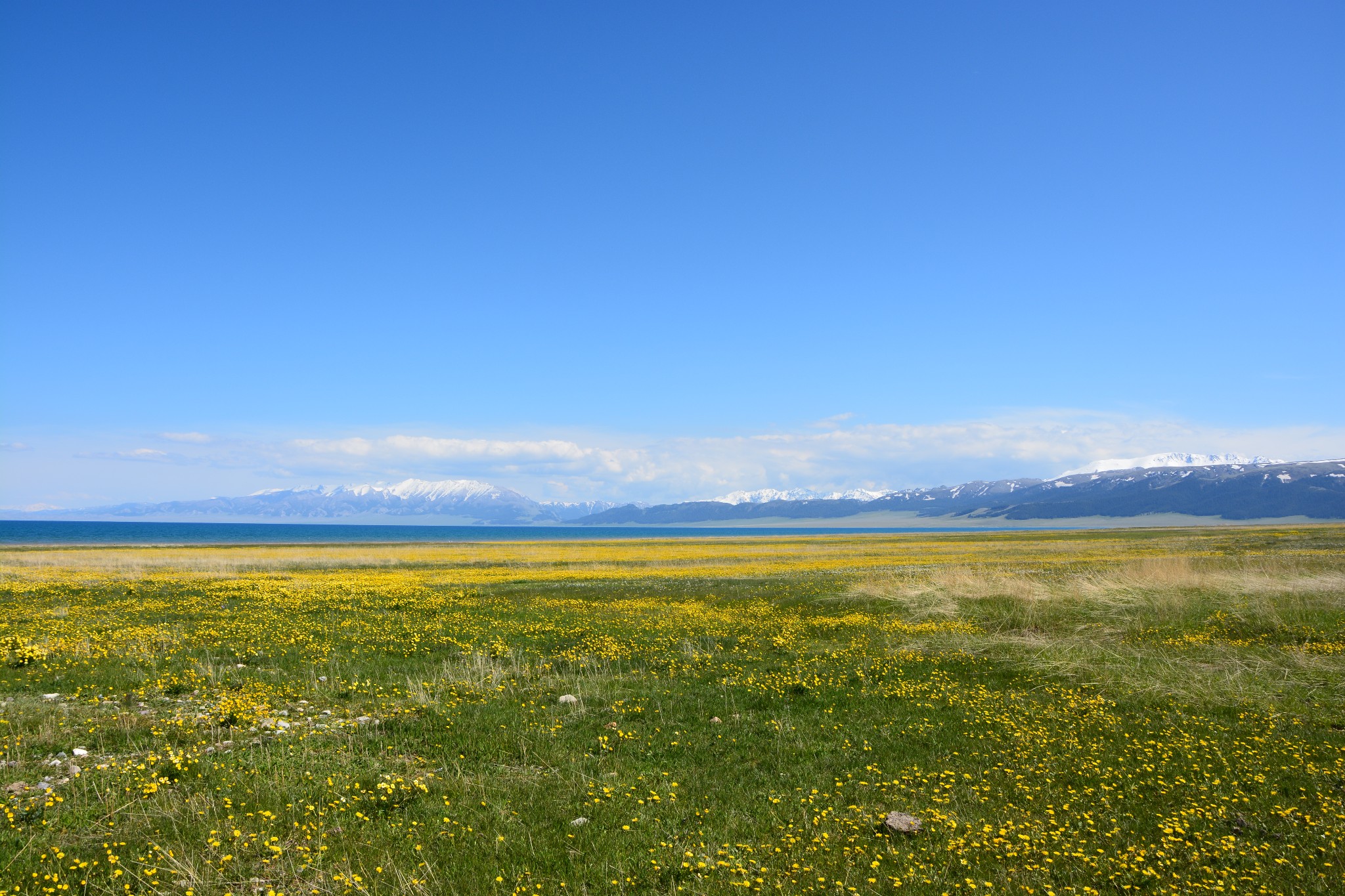 沿着连霍高速纵情奔驰,当高速公路两侧出现大量风力发电机的巨大机组时,本次伊犁行程的第一个目的地,赛里木湖,就已默默守在道边不远处,静候我们这些唐突而来的拜访者。雪山下一汪碧蓝的湖水波光粼粼,湖面掠过几只鸥鸟,翻飞起伏,湖边黄白相间的野花在清新的湖风中轻轻摇曳。此情此景,像极了一位久居深闺的脱俗女子,悄悄打开二楼的绣窗,有些羞涩又有些期待地打量着街巷上的人和物,渐渐的,她沉浸在自己的心事里,默然无语,却未曾意料到,在川流行人的眼中,她才是那道最靓丽的风景。