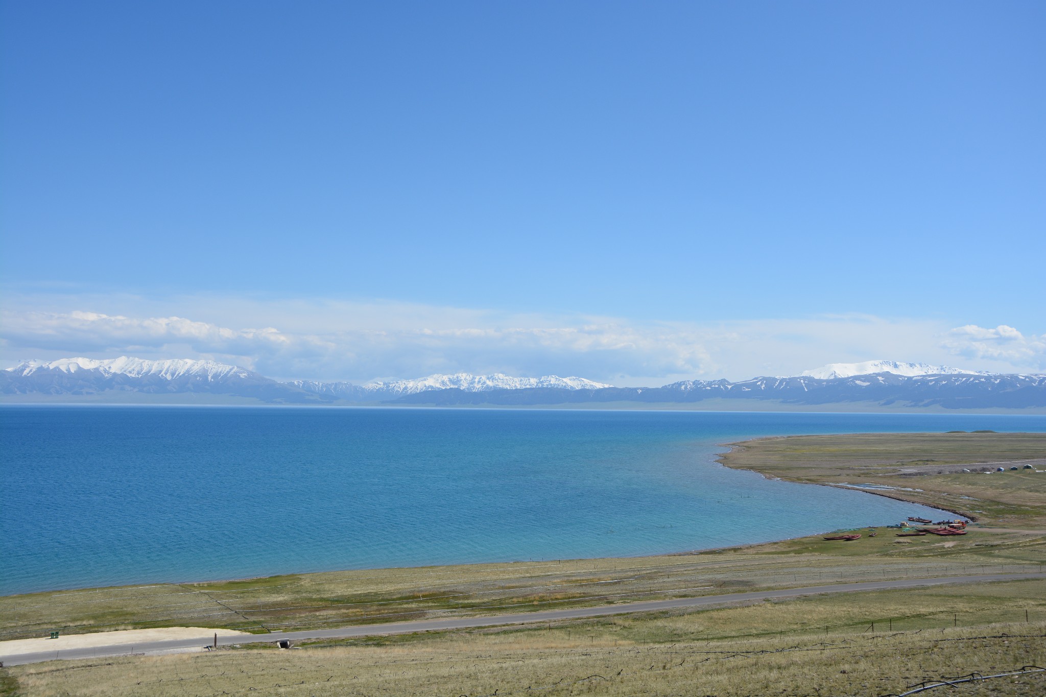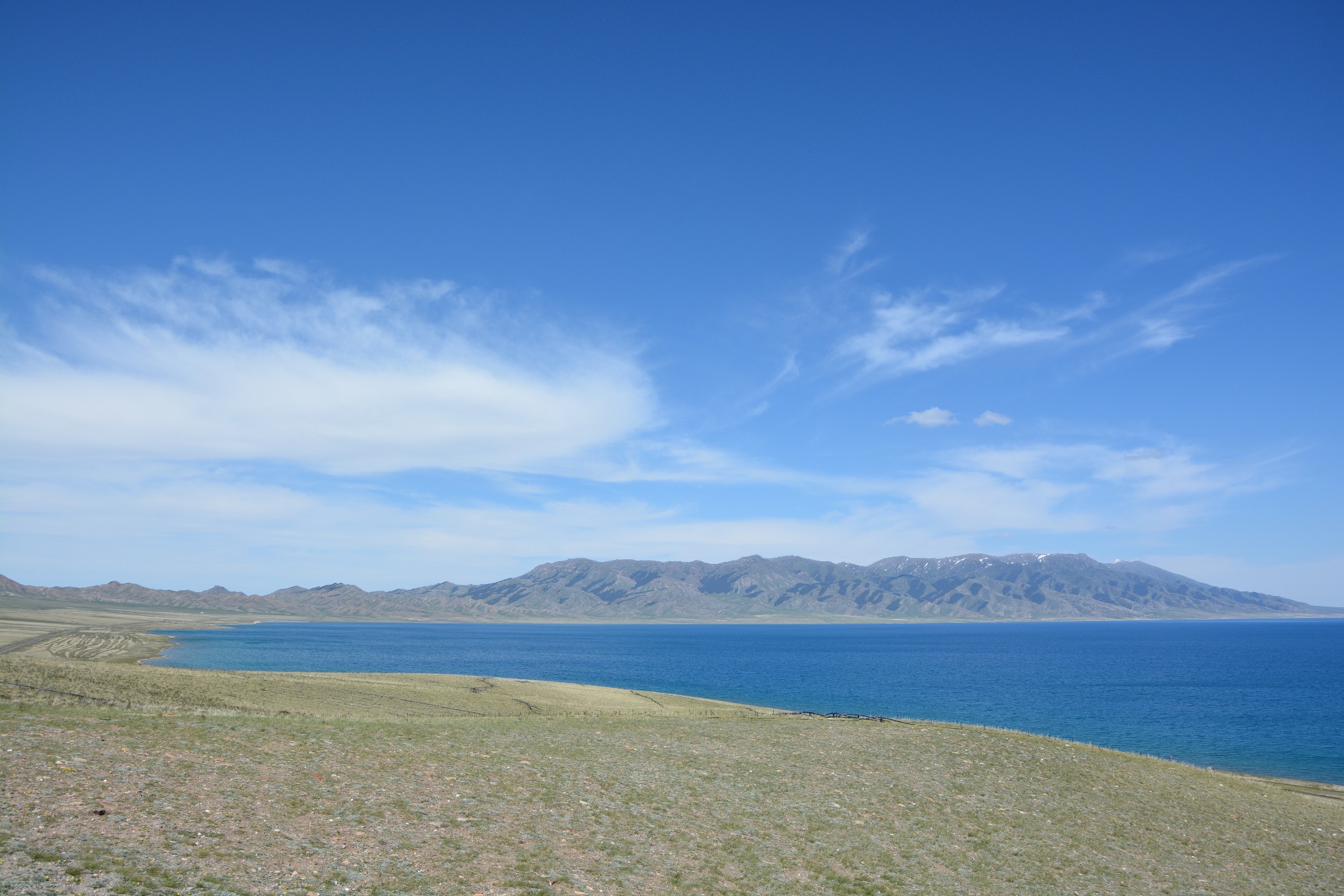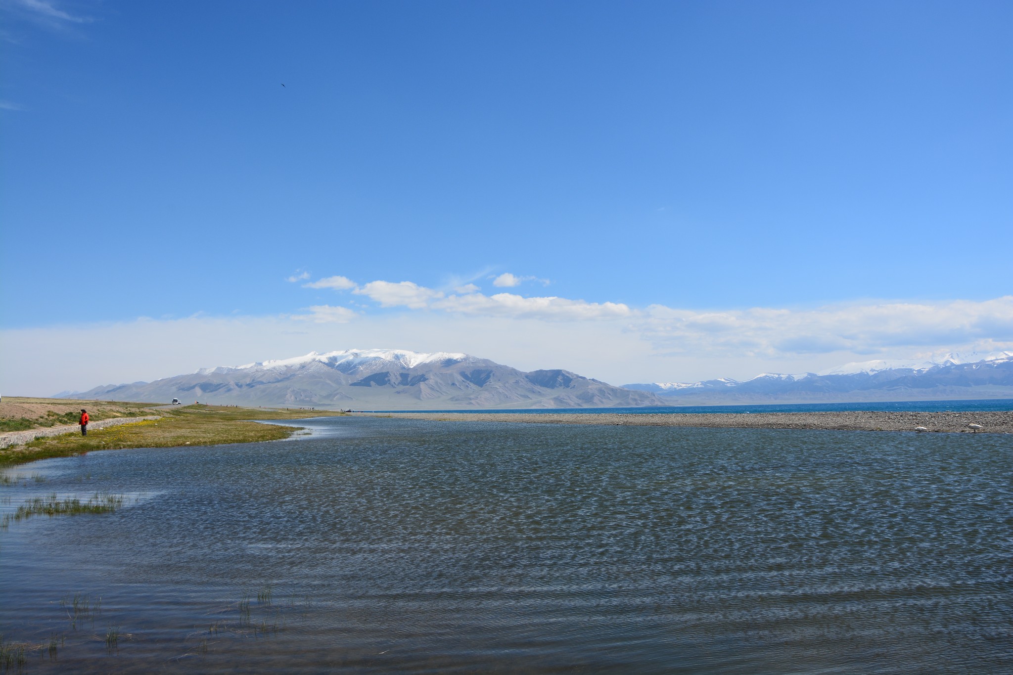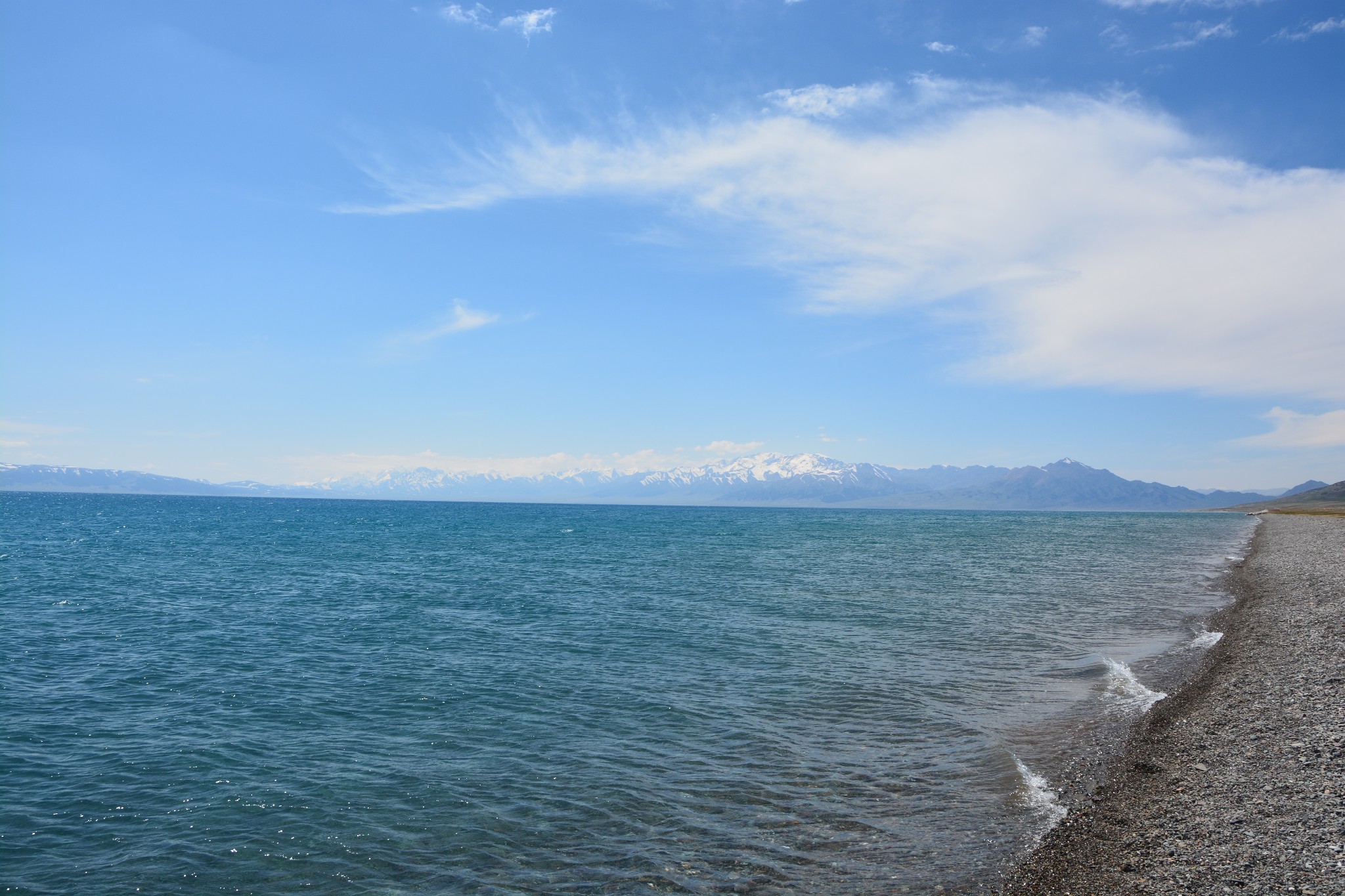 沿着连霍高速纵情奔驰,当高速公路两侧出现大量风力发电机的巨大机组时,本次伊犁行程的第一个目的地,赛里木湖,就已默默守在道边不远处,静候我们这些唐突而来的拜访者。雪山下一汪碧蓝的湖水波光粼粼,湖面掠过几只鸥鸟,翻飞起伏,湖边黄白相间的野花在清新的湖风中轻轻摇曳。此情此景,像极了一位久居深闺的脱俗女子,悄悄打开二楼的绣窗,有些羞涩又有些期待地打量着街巷上的人和物,渐渐的,她沉浸在自己的心事里,默然无语,却未曾意料到,在川流行人的眼中,她才是那道最靓丽的风景。