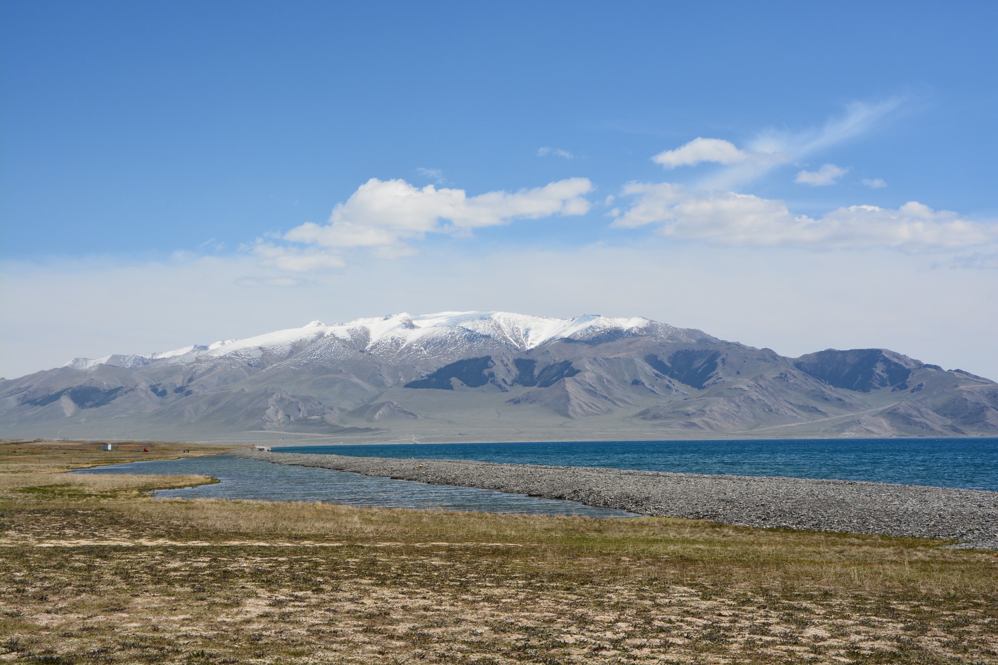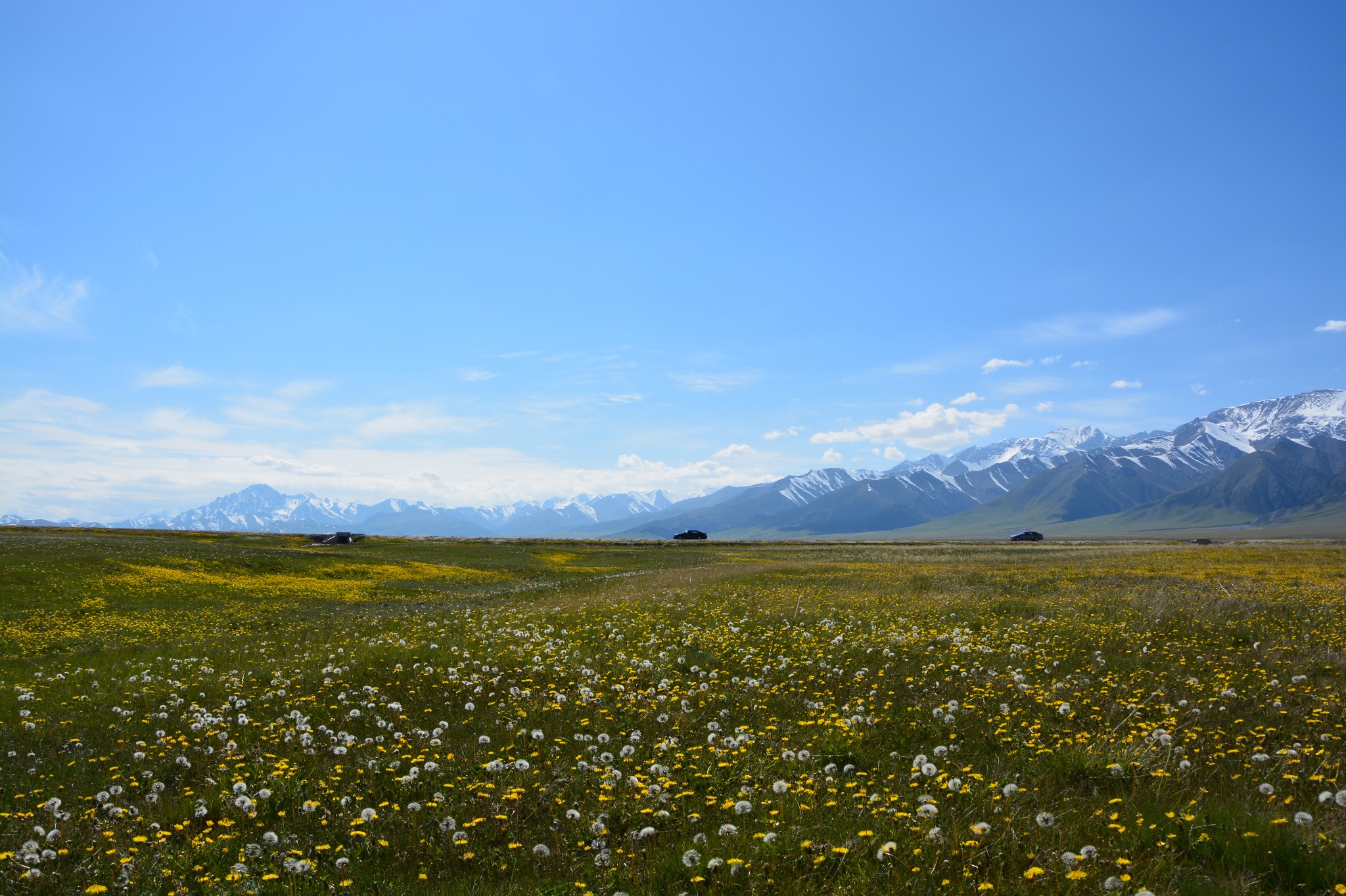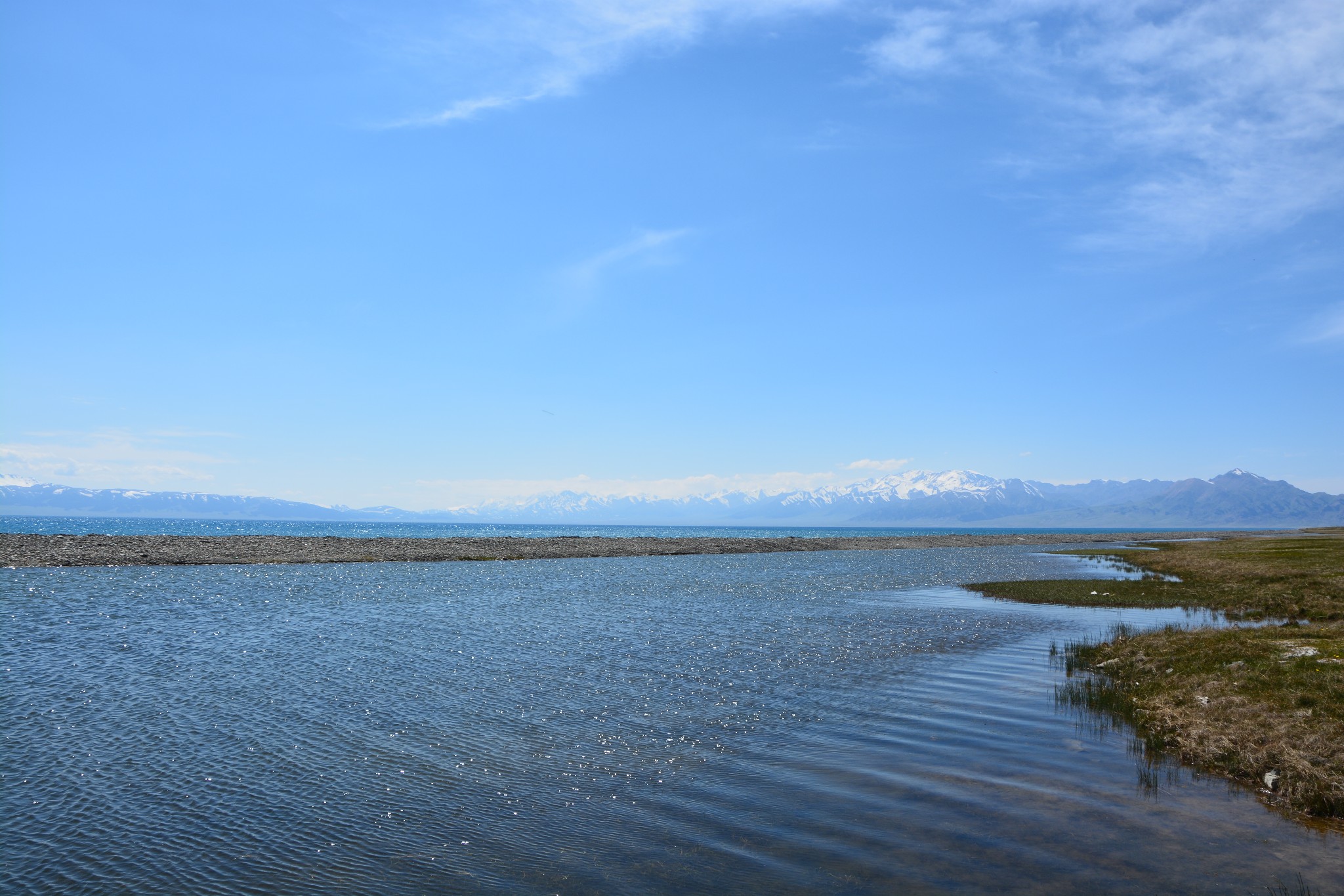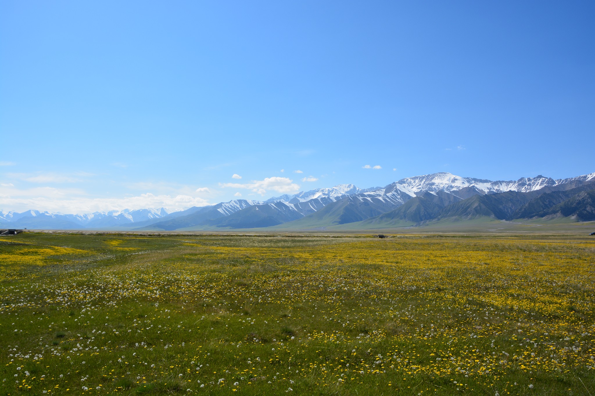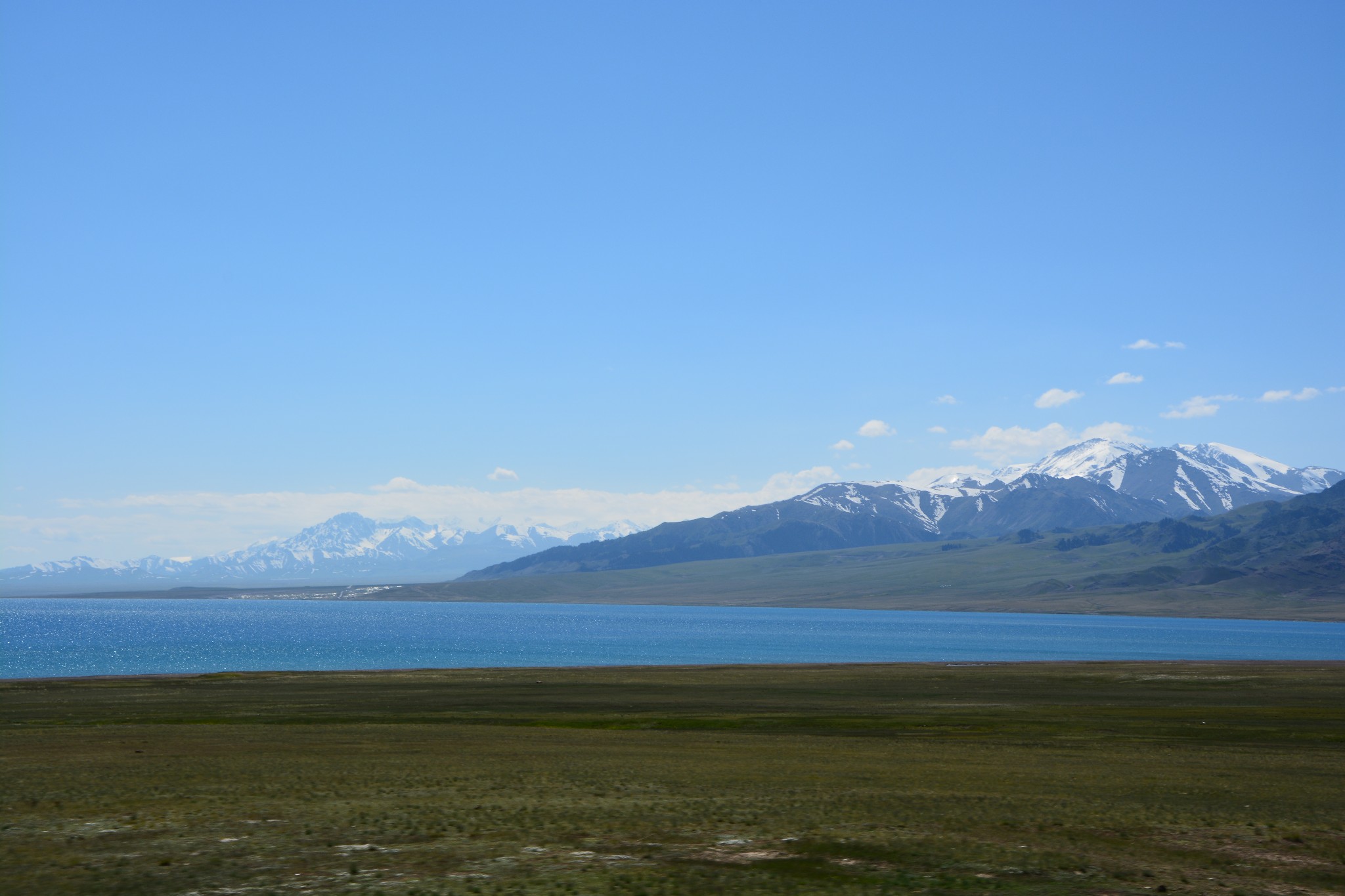 沿着连霍高速纵情奔驰,当高速公路两侧出现大量风力发电机的巨大机组时,本次伊犁行程的第一个目的地,赛里木湖,就已默默守在道边不远处,静候我们这些唐突而来的拜访者。雪山下一汪碧蓝的湖水波光粼粼,湖面掠过几只鸥鸟,翻飞起伏,湖边黄白相间的野花在清新的湖风中轻轻摇曳。此情此景,像极了一位久居深闺的脱俗女子,悄悄打开二楼的绣窗,有些羞涩又有些期待地打量着街巷上的人和物,渐渐的,她沉浸在自己的心事里,默然无语,却未曾意料到,在川流行人的眼中,她才是那道最靓丽的风景。