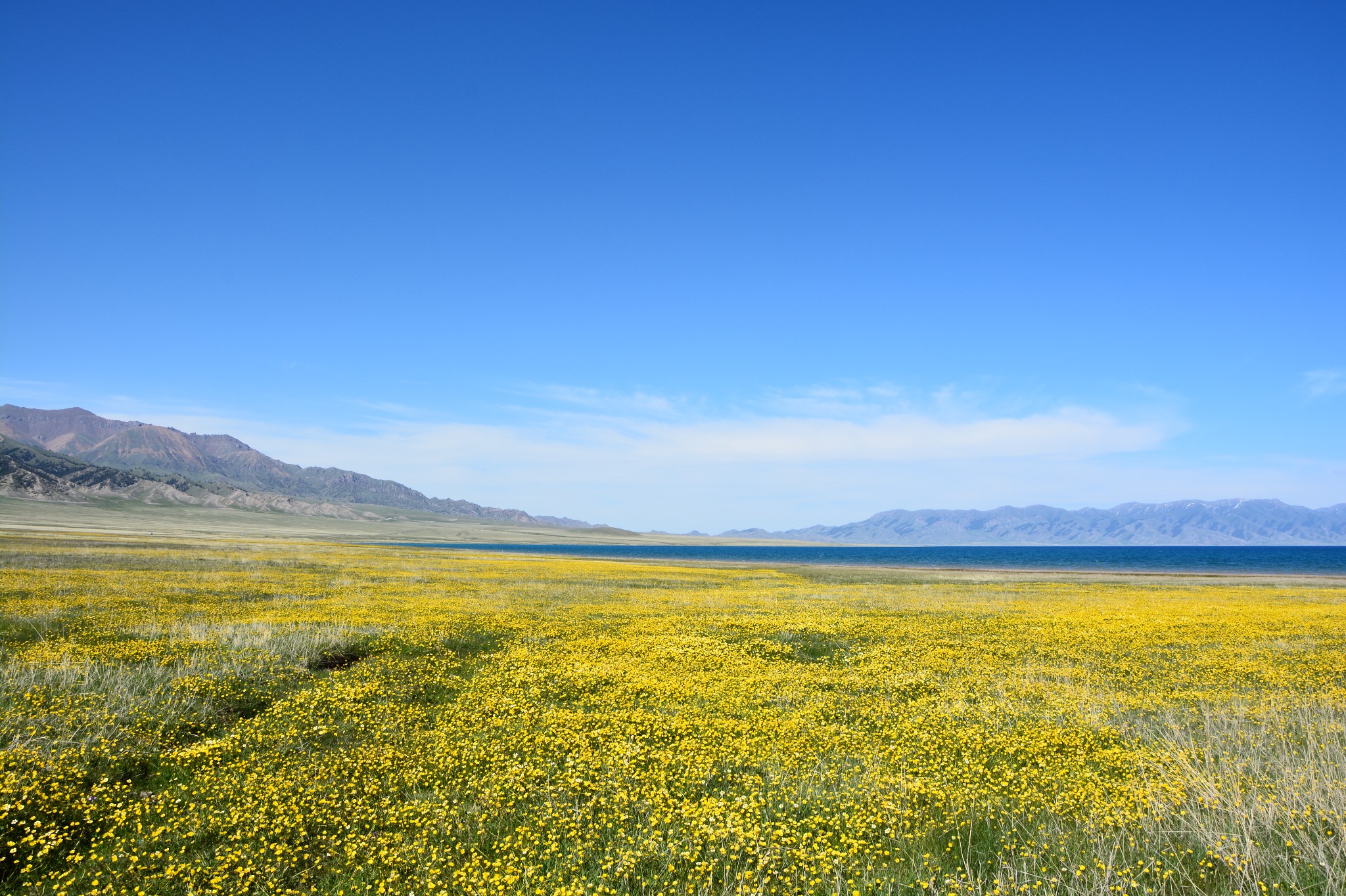 驱车绕到鲜花盛开的湖畔,周围数百米内只有稀稀拉拉的几台车和十几个游人,更加显得这天地苍穹的壮阔与寂寥。我沿着前人踏出的泥路,深一脚浅一脚,走向微澜涌动的湖边。一边走,一边小心避开脚下娇嫩柔弱的野花,生怕惊扰或是践踏了这些似乎已经通灵的小小生命。