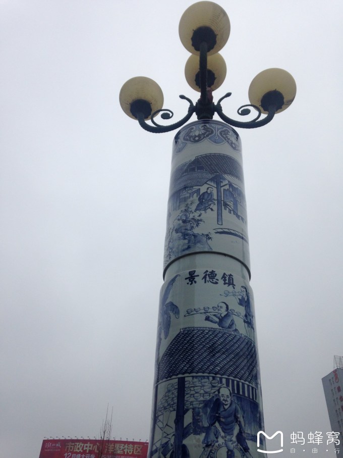 1月9号下午到达景德镇汽车站,一下车就忍不住四处打量,看看这瓷都到底有啥不一样,然而我只看到了汽车站附近的一个雕塑。在出 租车 上,也只能看到这座城市的路灯都是由陶瓷做的。