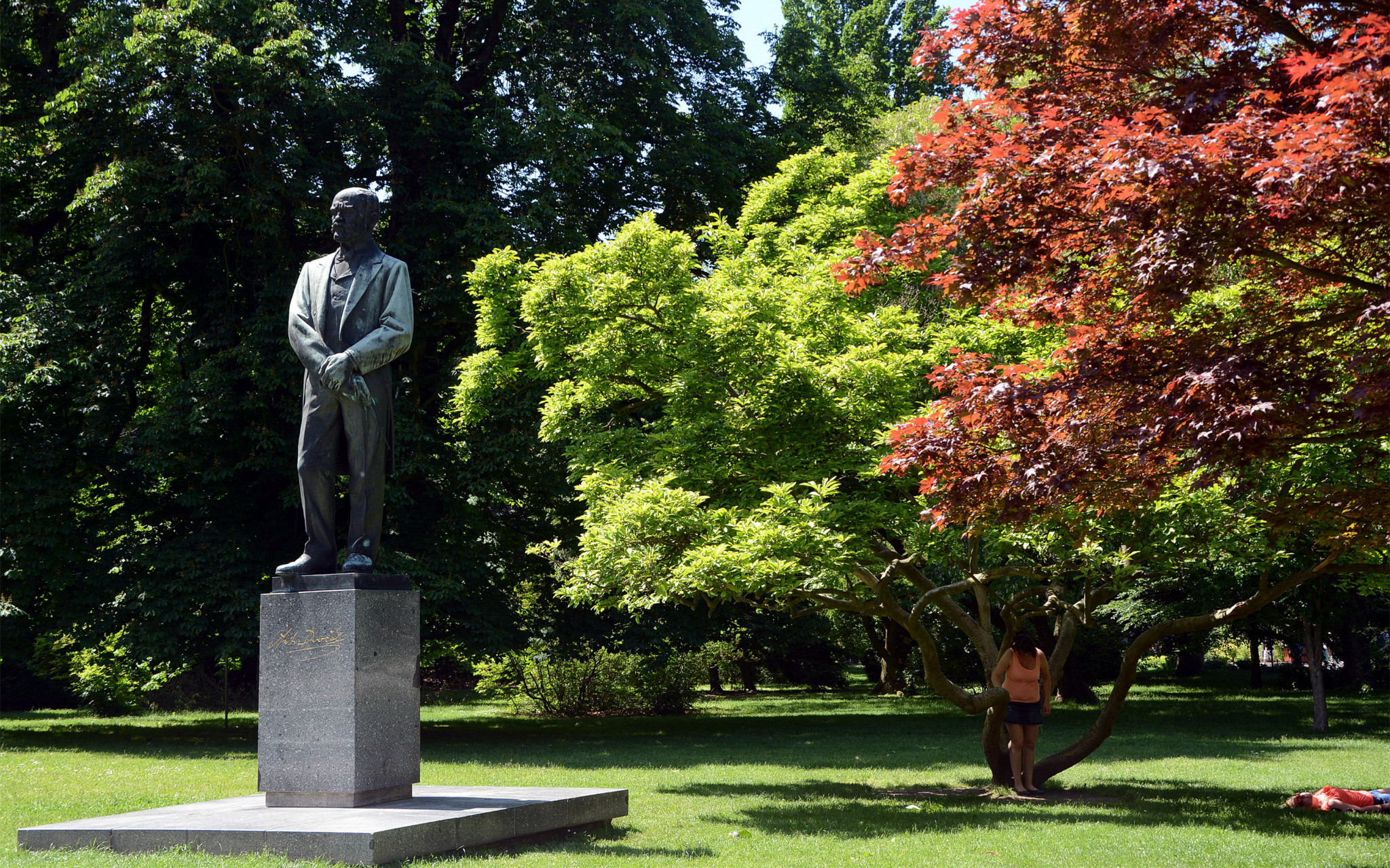 郁郁葱葱的草地上,德沃夏克铜像铜像掩映在树丛中。我仔细一看,正是德沃夏克。