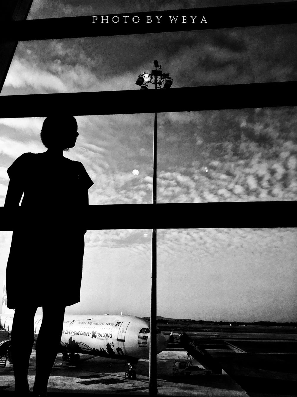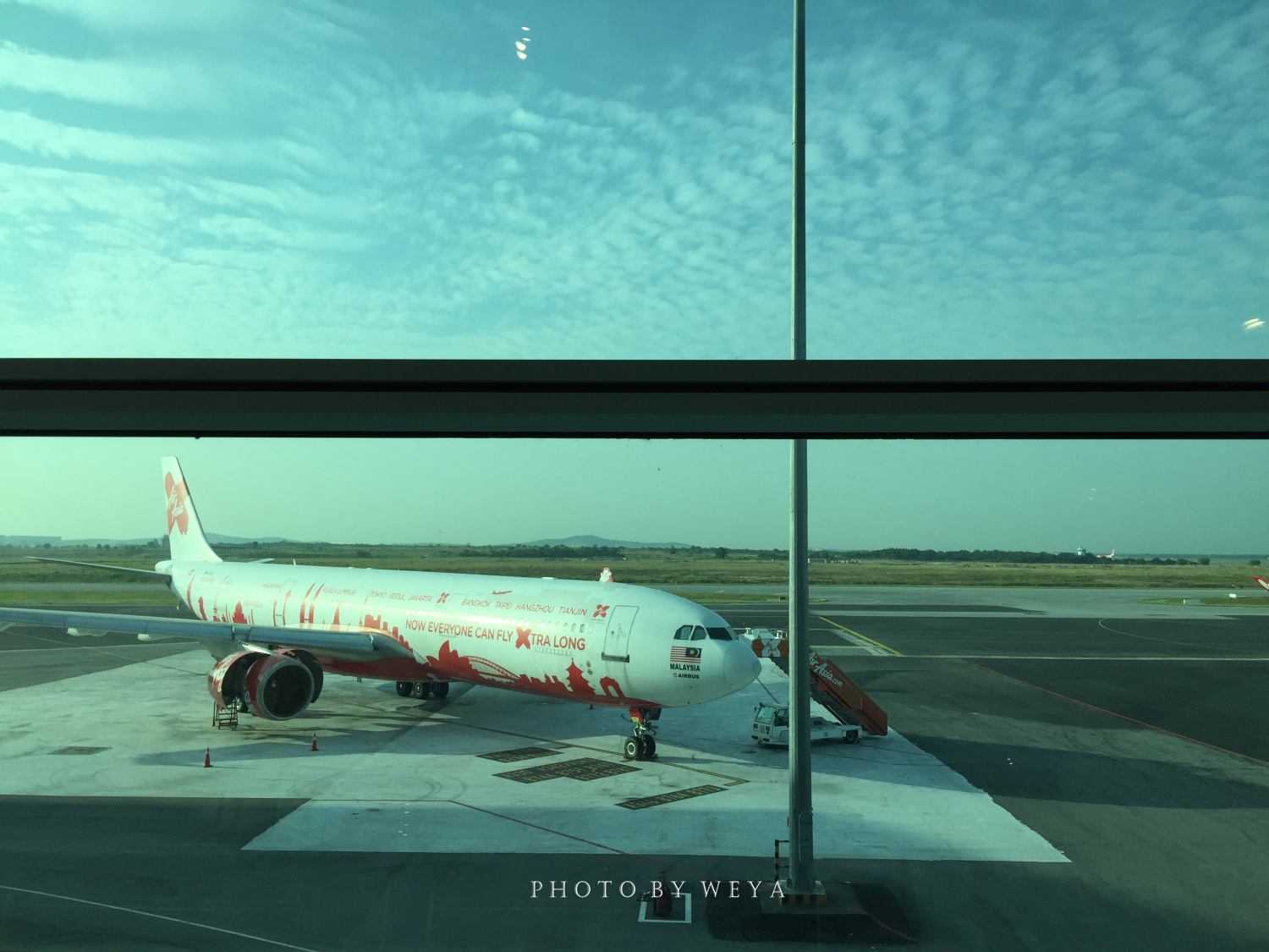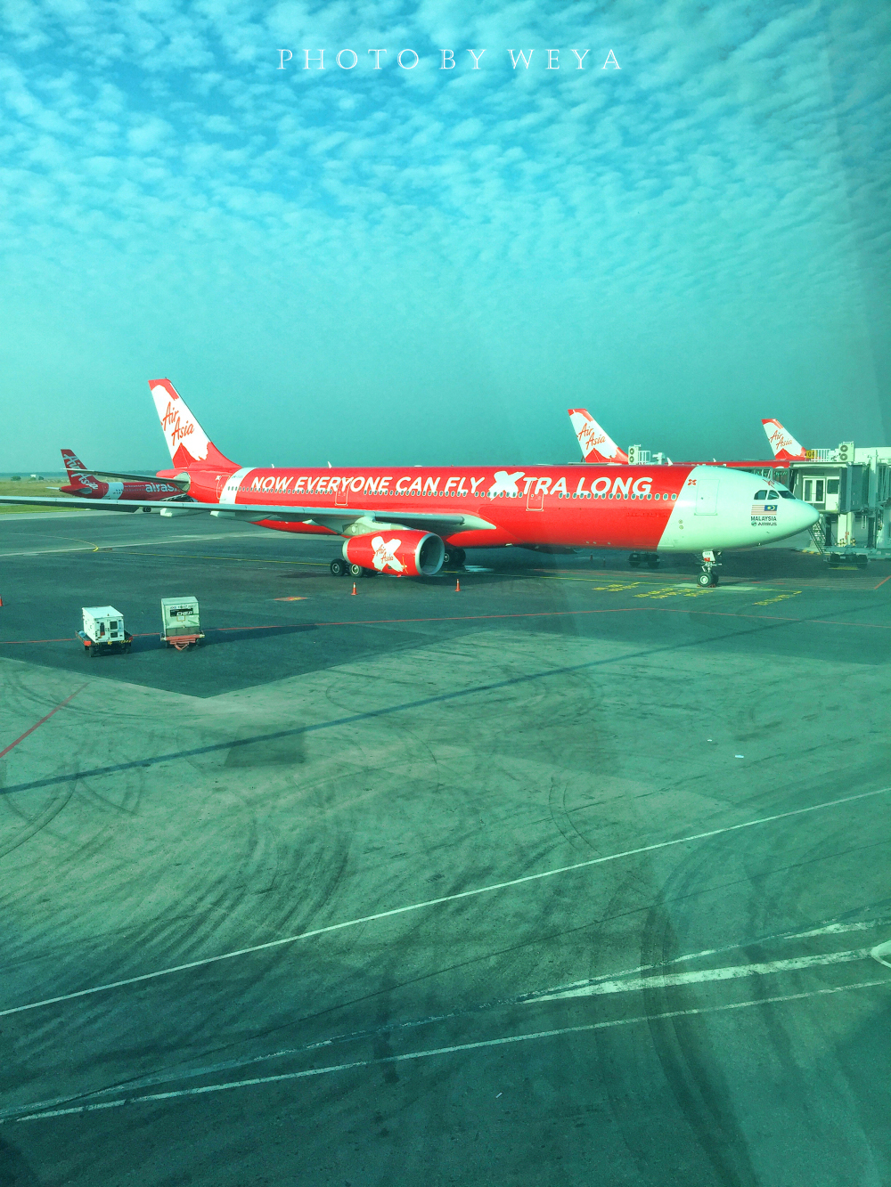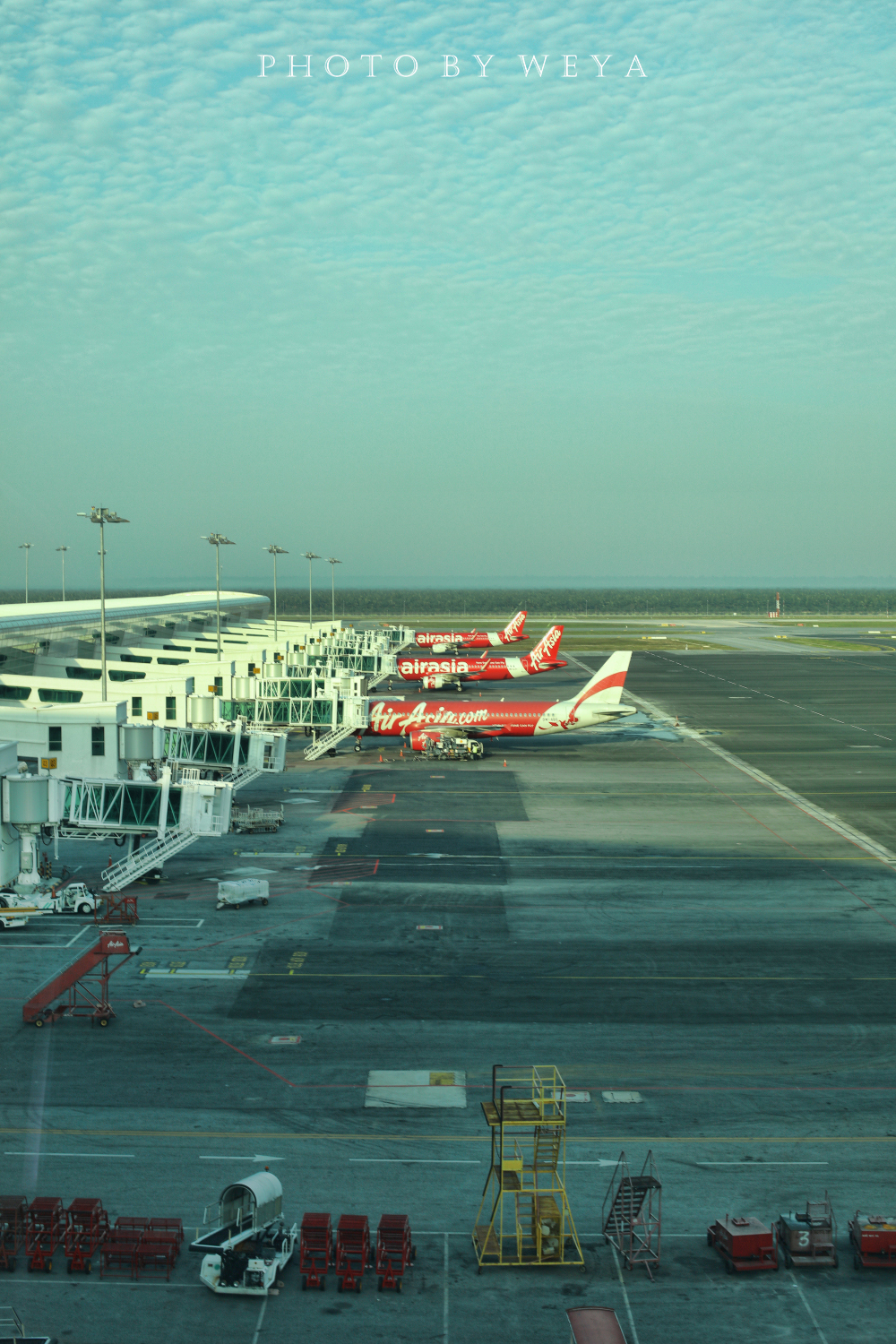 亚航的飞机是出了名的冷啊!而且因为是廉价航空连张毯子都没有!我穿着长裙厚袜长袖外套还裹了一张披肩依旧在夜里冻得瑟瑟发抖,整个飞行过程也就睡着了一个小时不到。凌晨五点,我们降落在吉隆坡机场,办理过境签,拿行李,再次换下一程的登机牌,过安检,我和狐狸已经感觉无比疲倦,找了个地方吃早饭,然后在机场照飞机??!!真是摄影师的恶趣味啊!