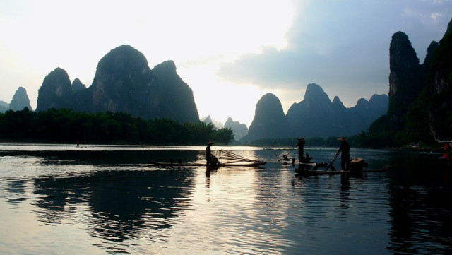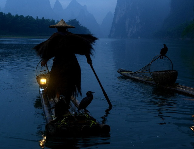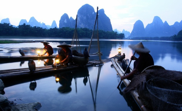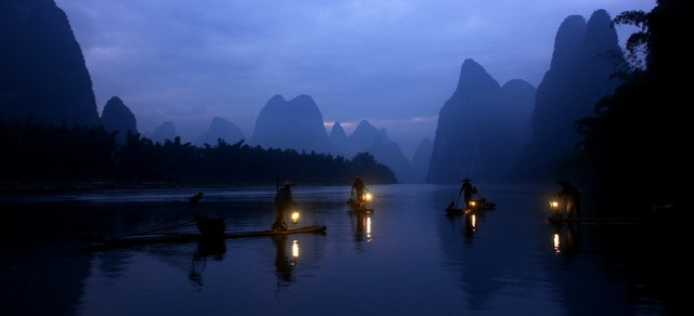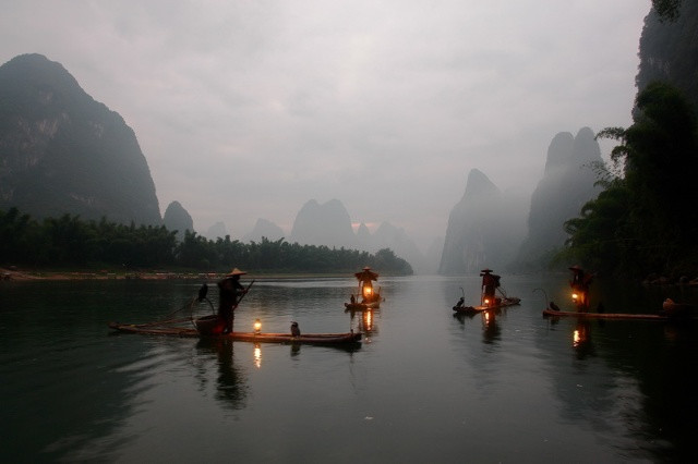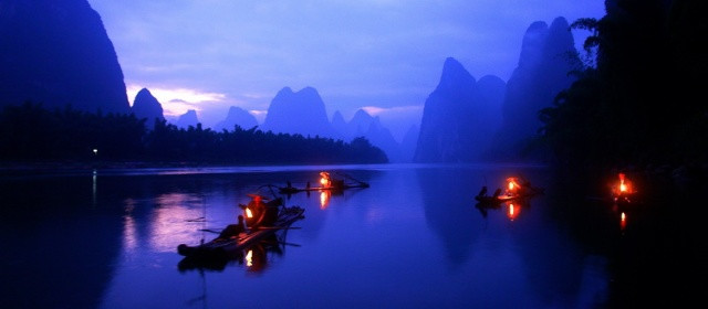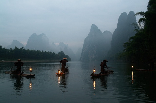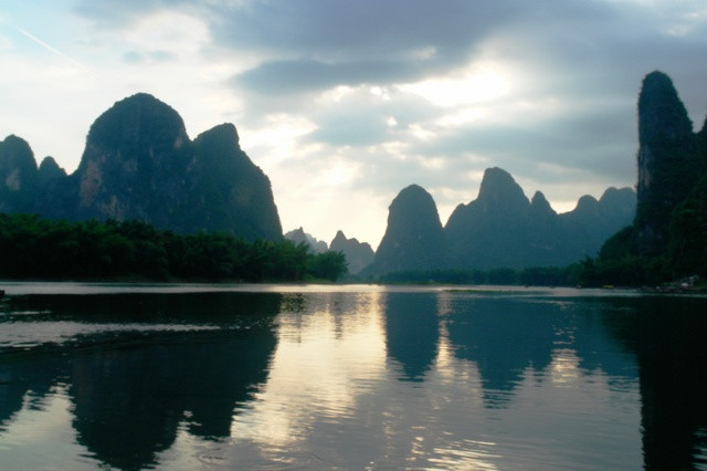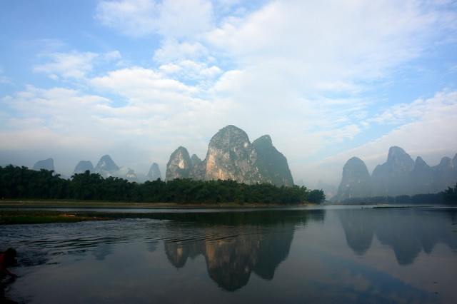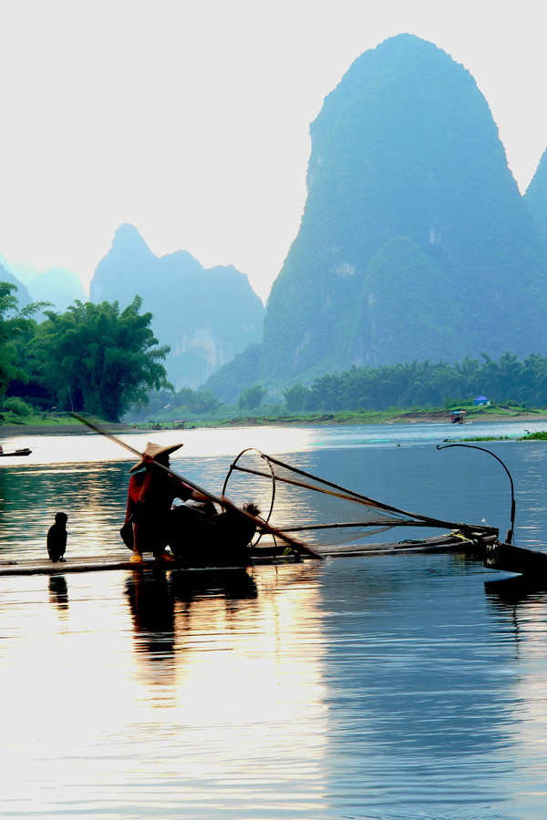 拍摄景点在兴坪附近的漓江边,当地人称之为佛子岩。1999年发行的第五套人民币面值20元纸币的选此景作为背景图案。此处上午可拍顺光的蓝天白云,下午可拍日落也可租几条竹排点上渔灯,拍摄漓江渔火的片子。只是上午、下午江面上船太多,画面不很干净。